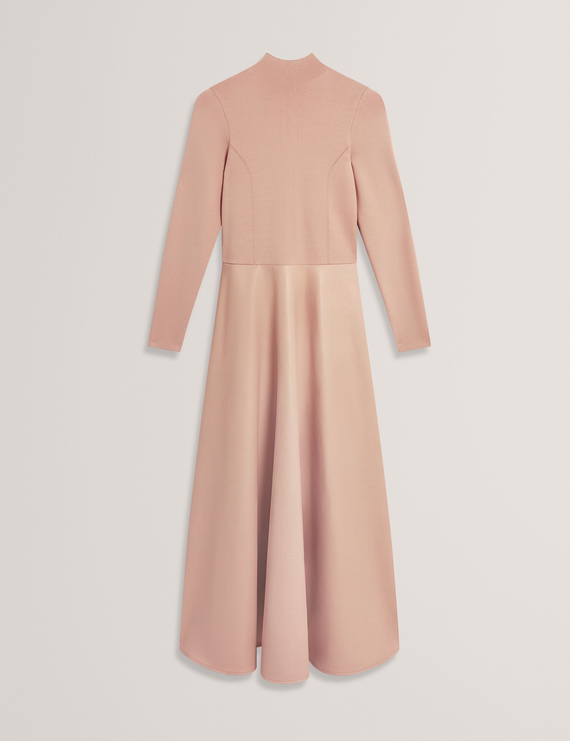 ALLMIE is the modern way to do monochrome dressing. Designed in a warm shade of taupe, this long sleeve midi dress pairs a high neck knit top with a ful faux leather skirt for the perfect balance of bold and elegant. Wear with boots to the office, or pair with strappy heels for an after-dark look.
