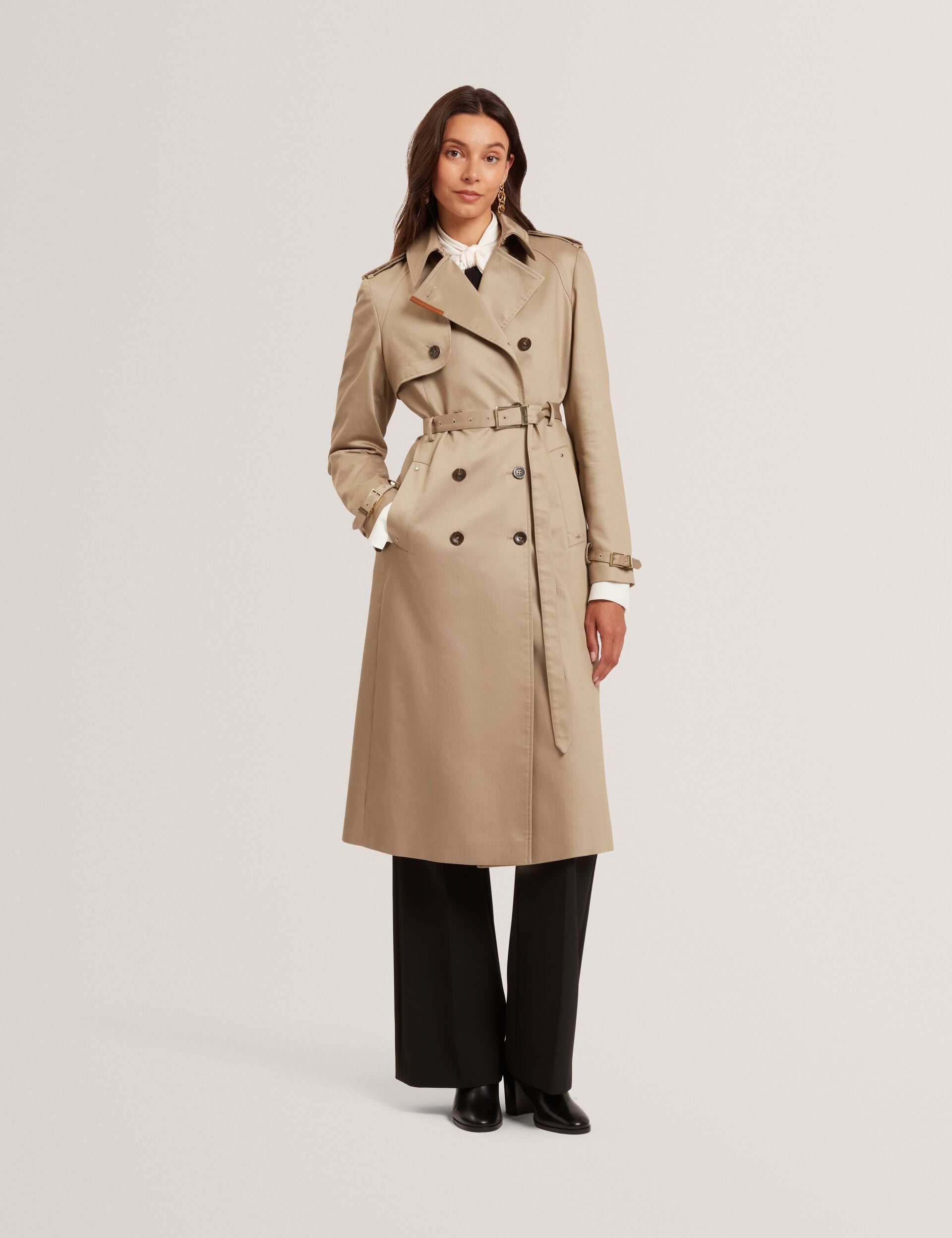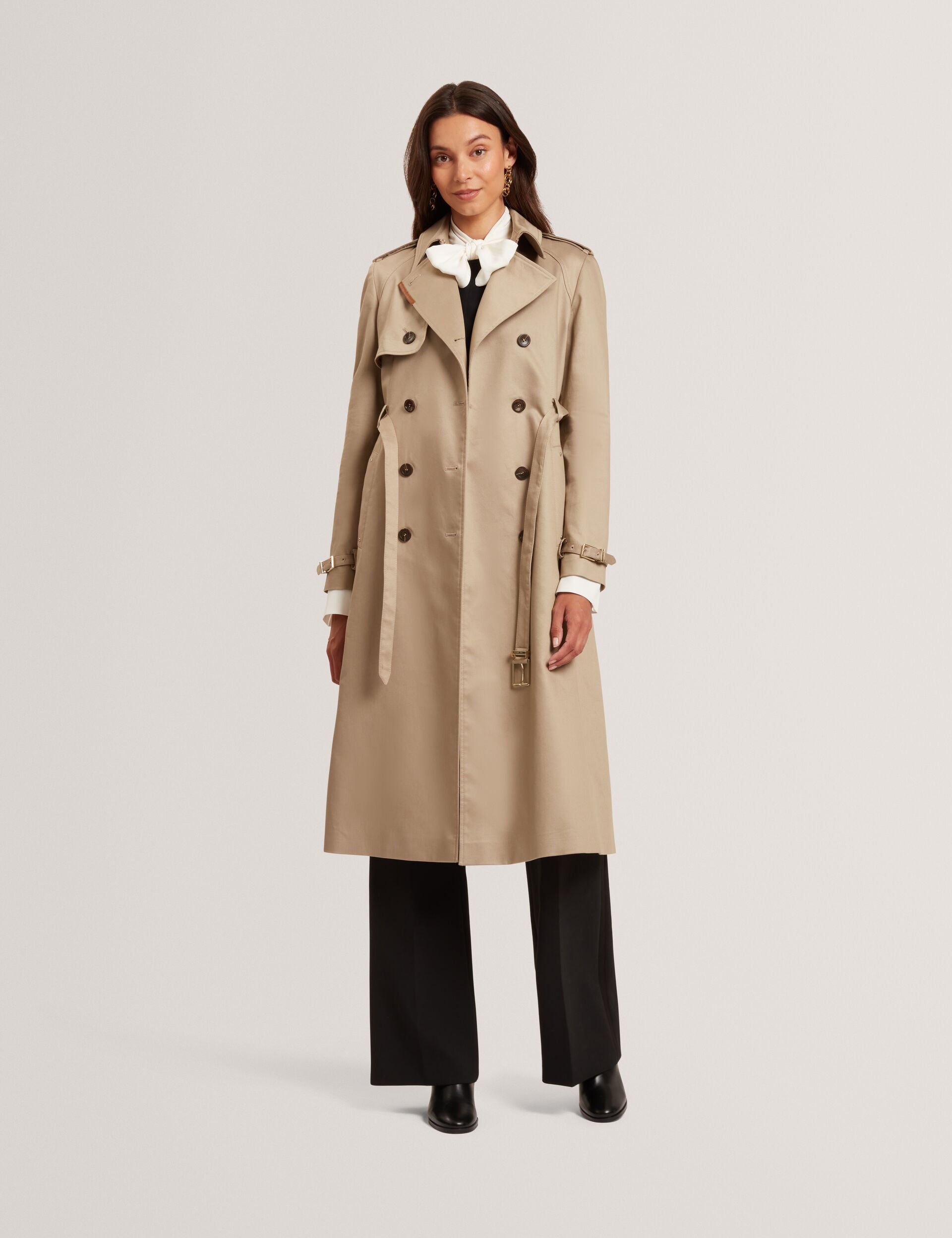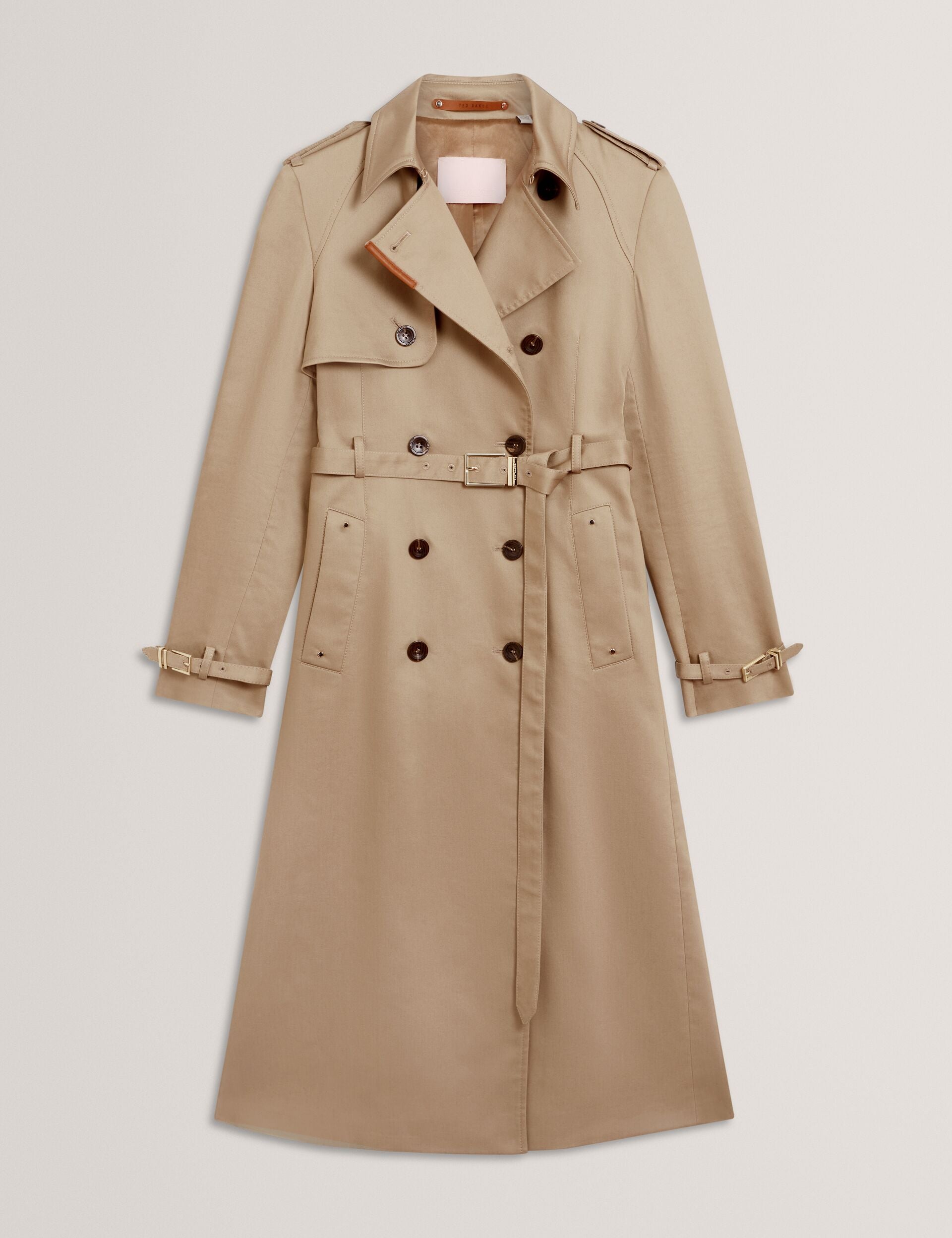 ARYTHA is a classic outerwear silhouette done the Ted way. This longline trench features a double-breasted design and sleek storm flaps, with belted fastenings added to the waist and sleeves for that cinched-in shape. Crafted from a cotton blend with a coated finish, it's timeless style that's made to last.