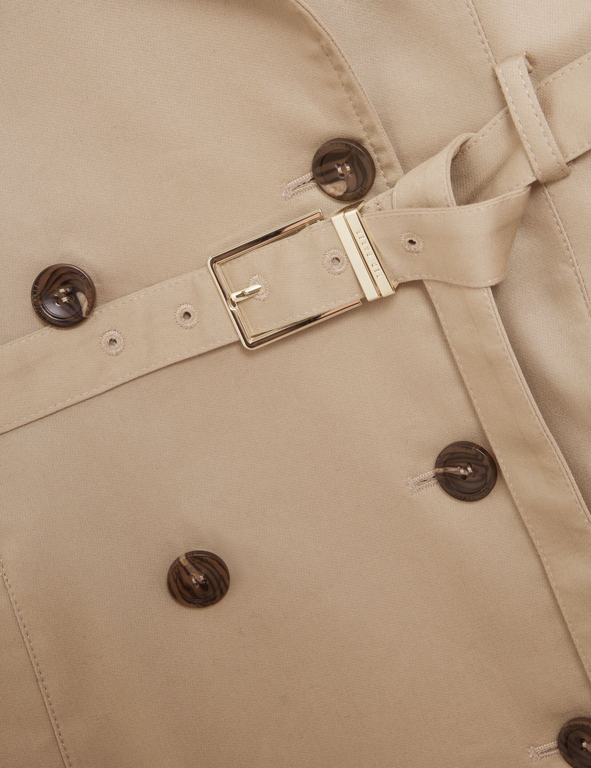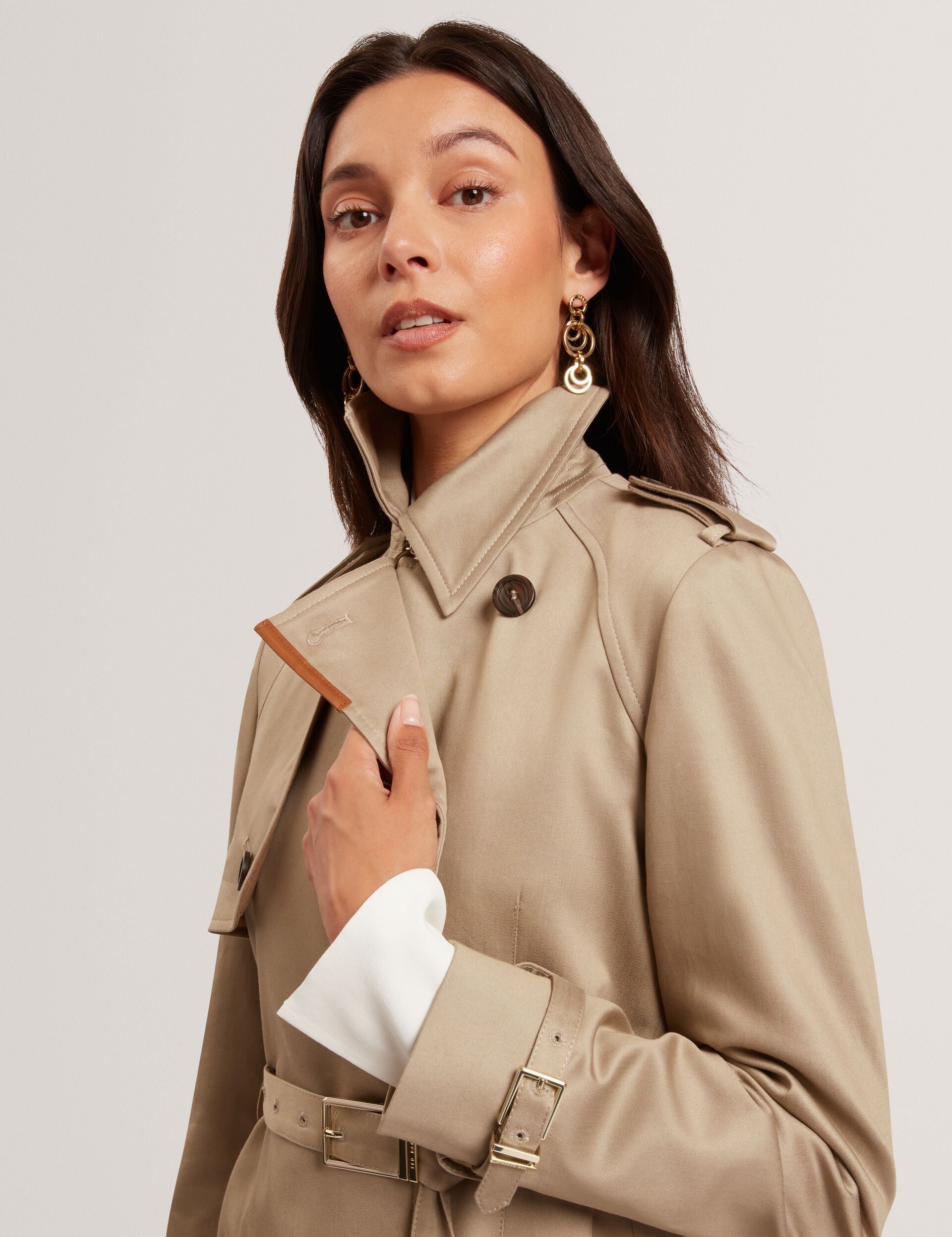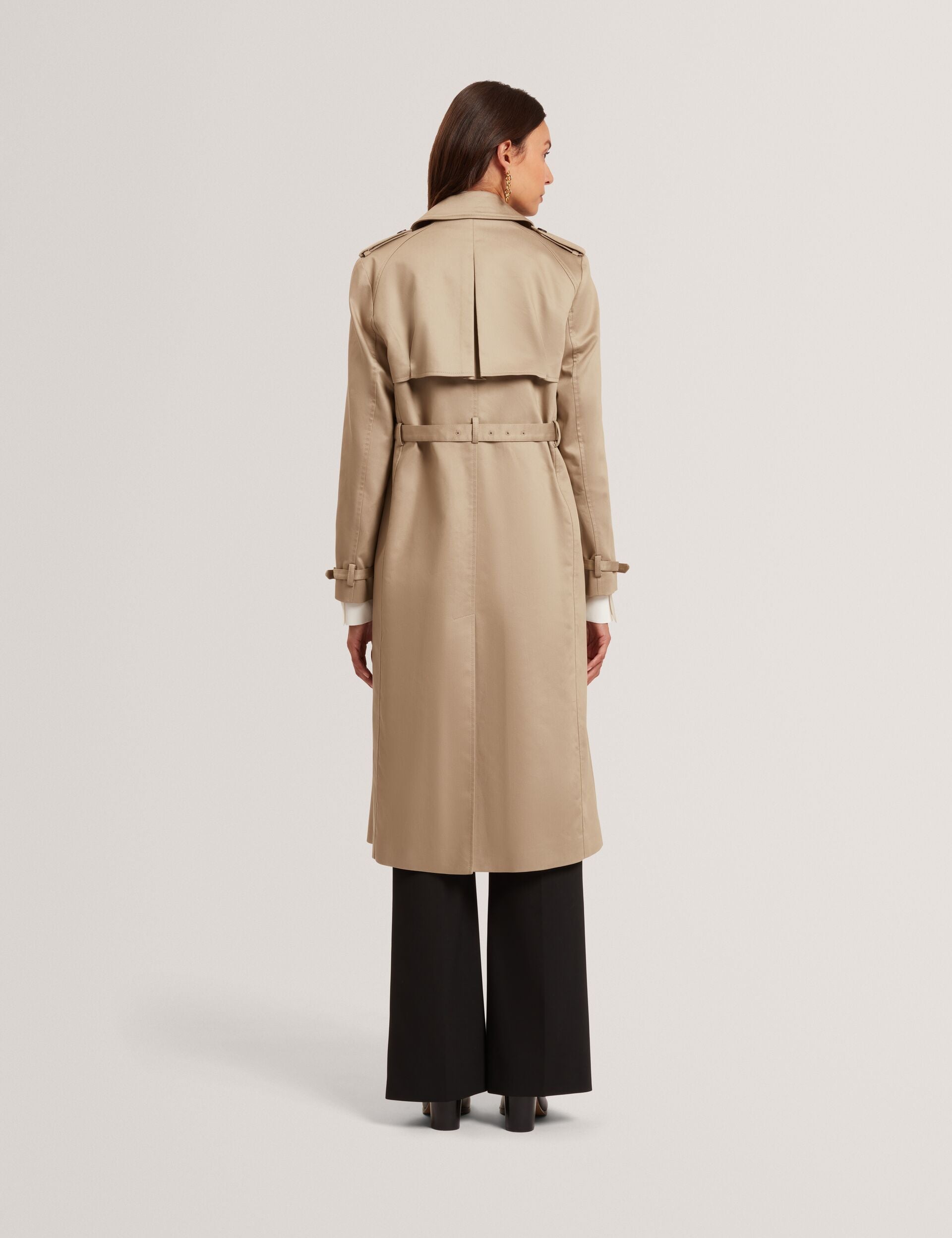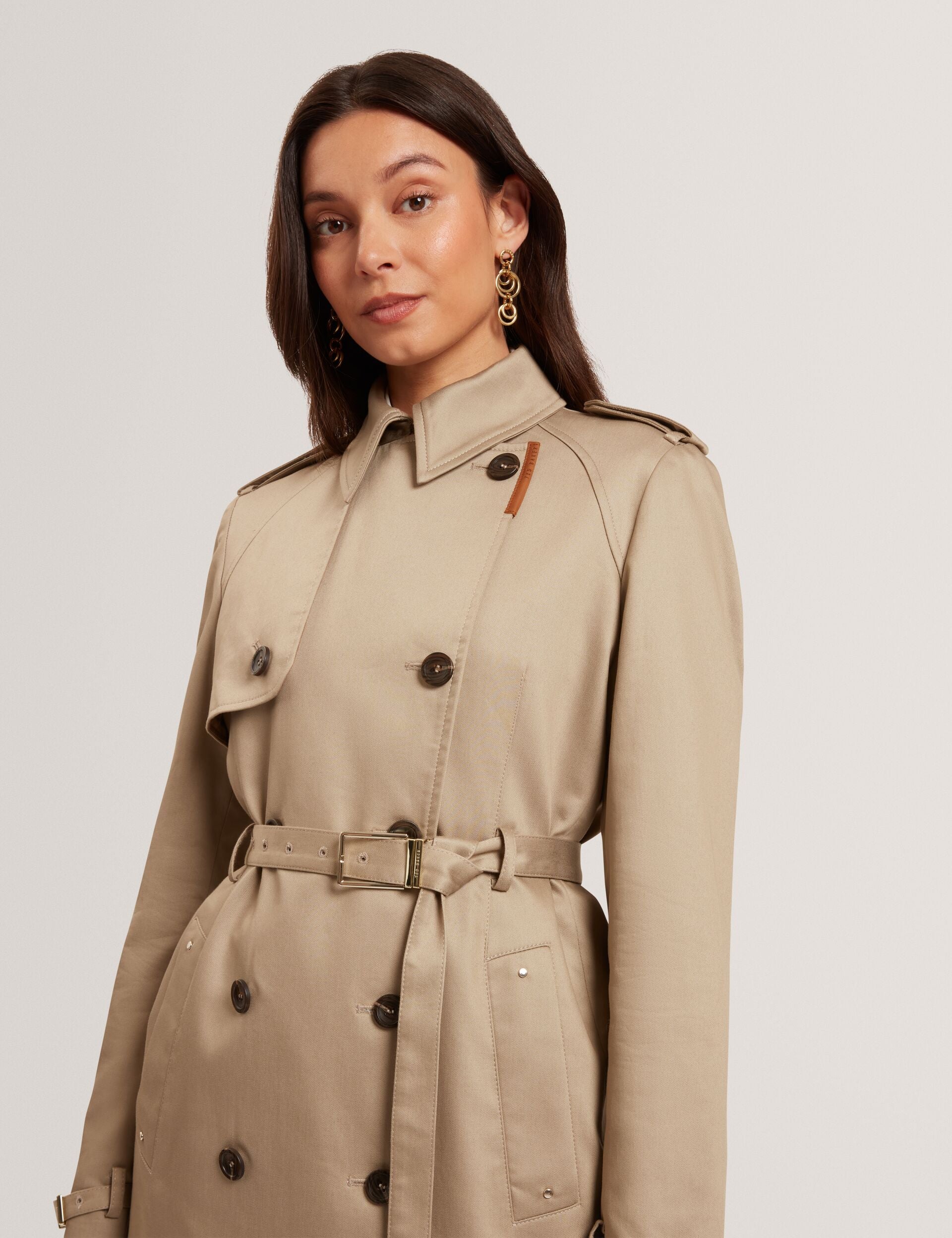 ARYTHA is a classic outerwear silhouette done the Ted way. This longline trench features a double-breasted design and sleek storm flaps, with belted fastenings added to the waist and sleeves for that cinched-in shape. Crafted from a cotton blend with a coated finish, it's timeless style that's made to last.