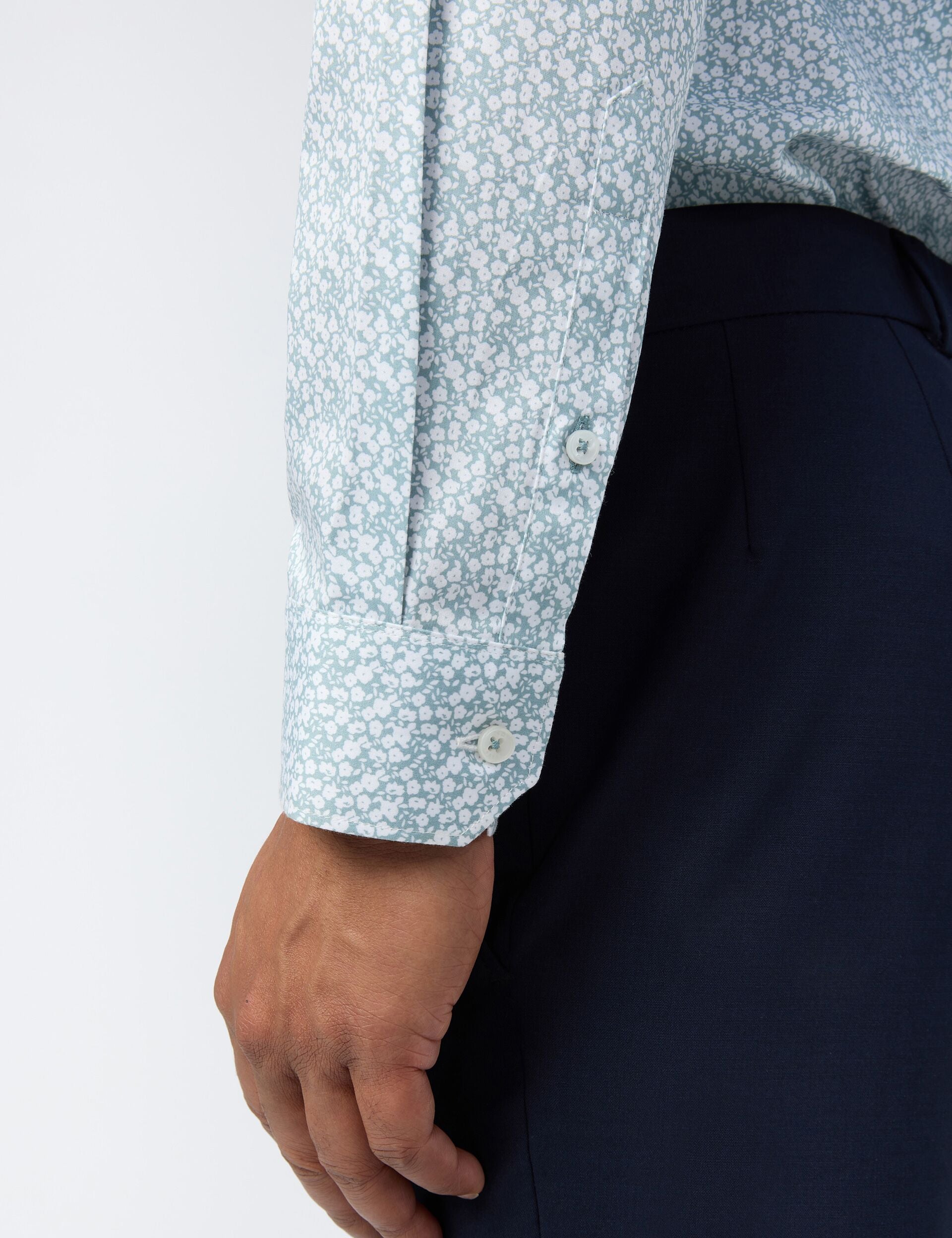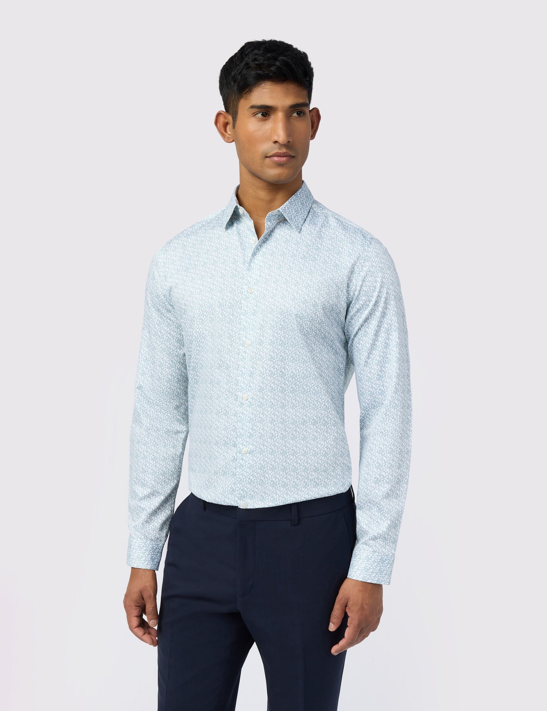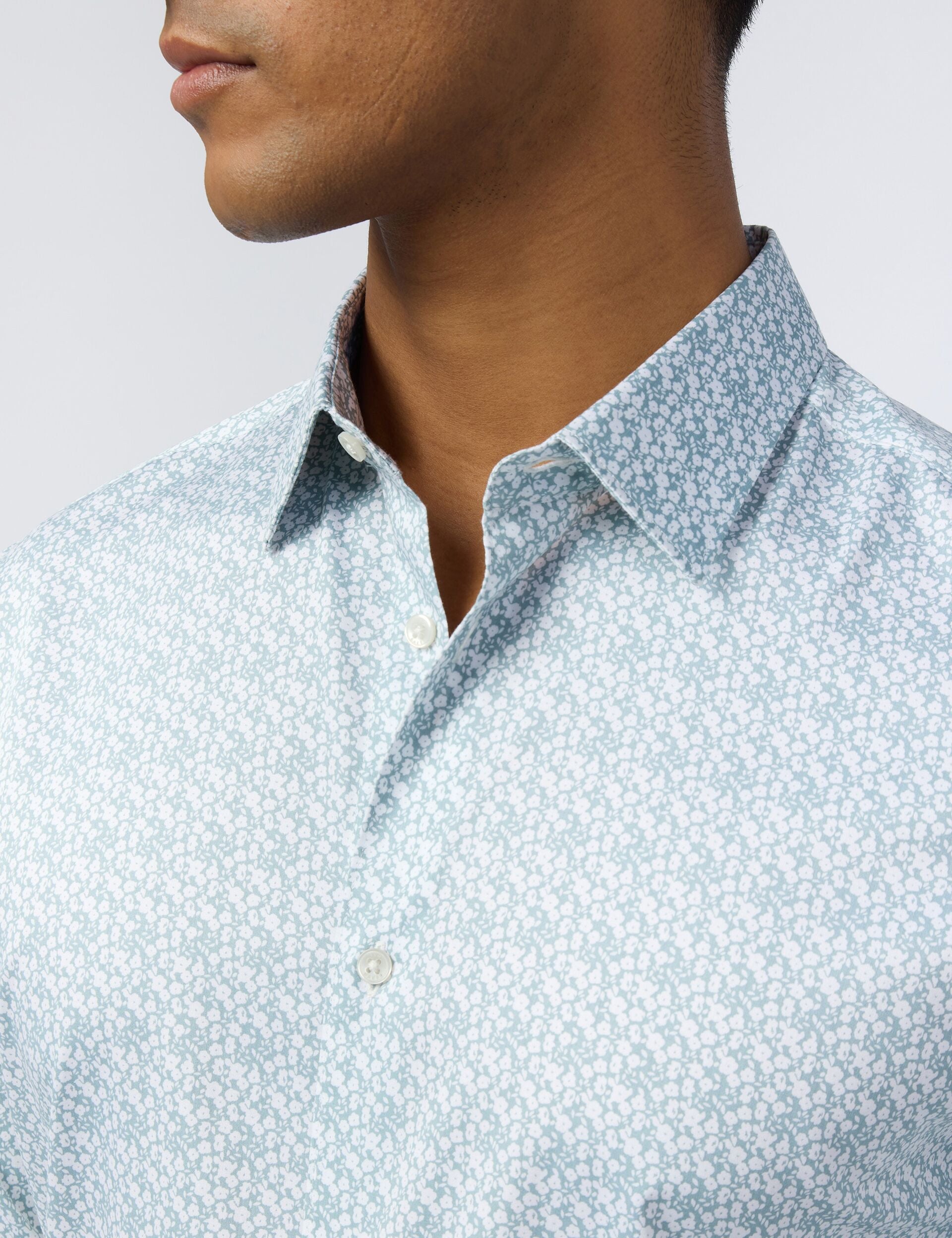 Designed with a white ditsy floral print on a duck egg blue base, the BEE slim fit shirt brings a fun twist to your tailoring. The soft sateen fabric not only looks sleek, but it provides all day comfort thanks to the breathable organic cotton blend with added stretch.