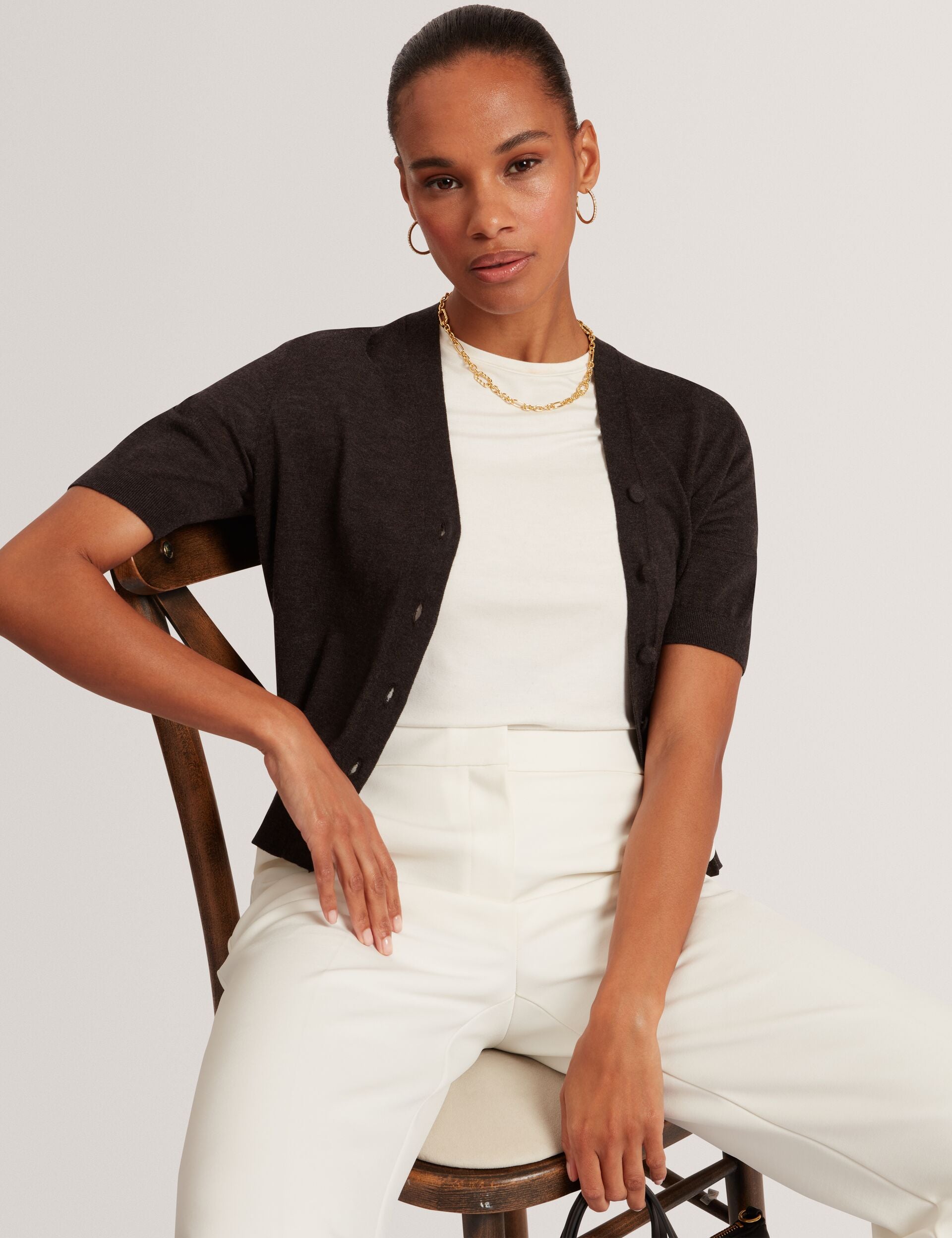 Made from a luxurious merino wool blend with a touch of silk, the DAZLIA short sleeve cardigan is your transitional wardrobe hero. Cut to a cropped length, this chic basic pairs perfectly with high-waisted pieces.