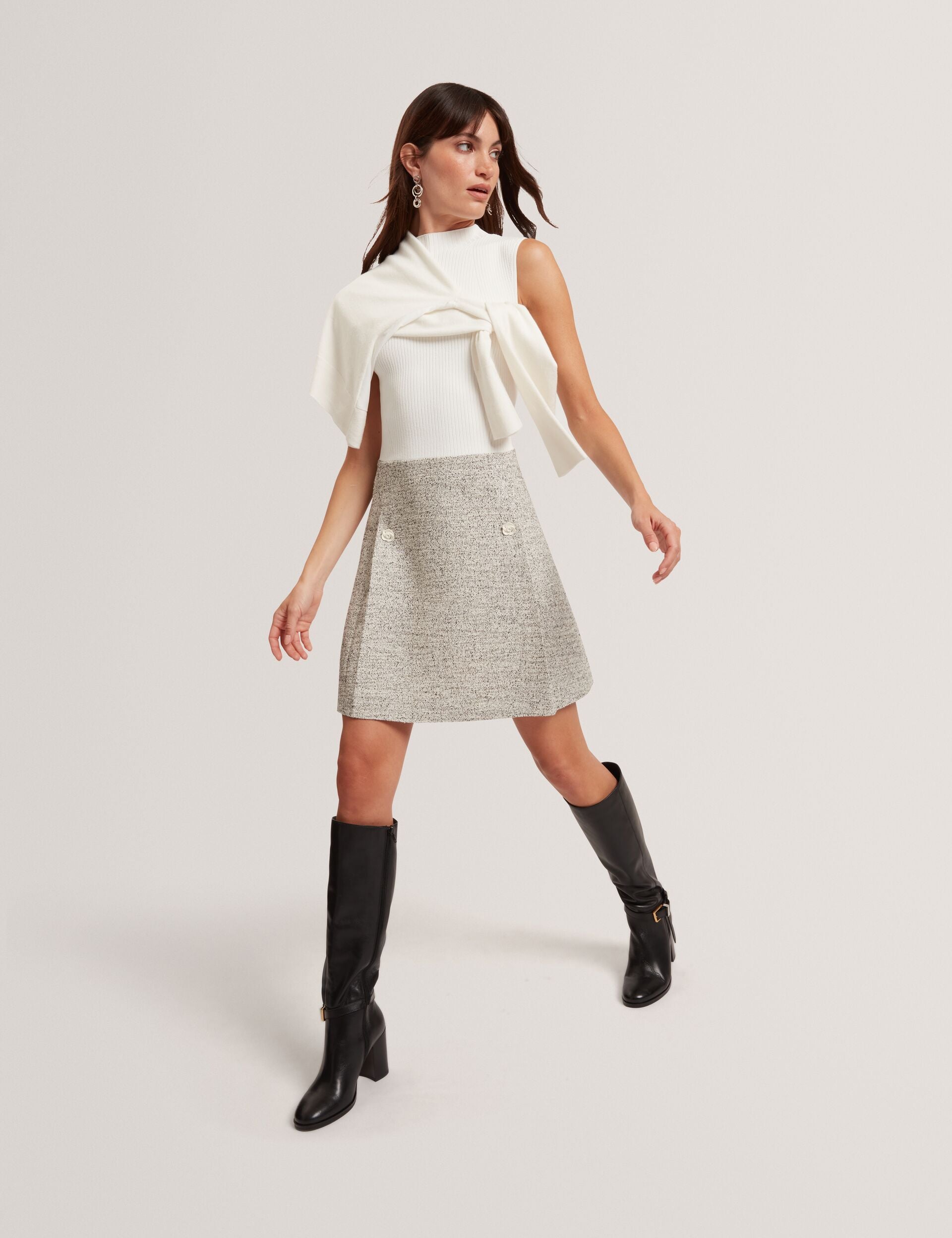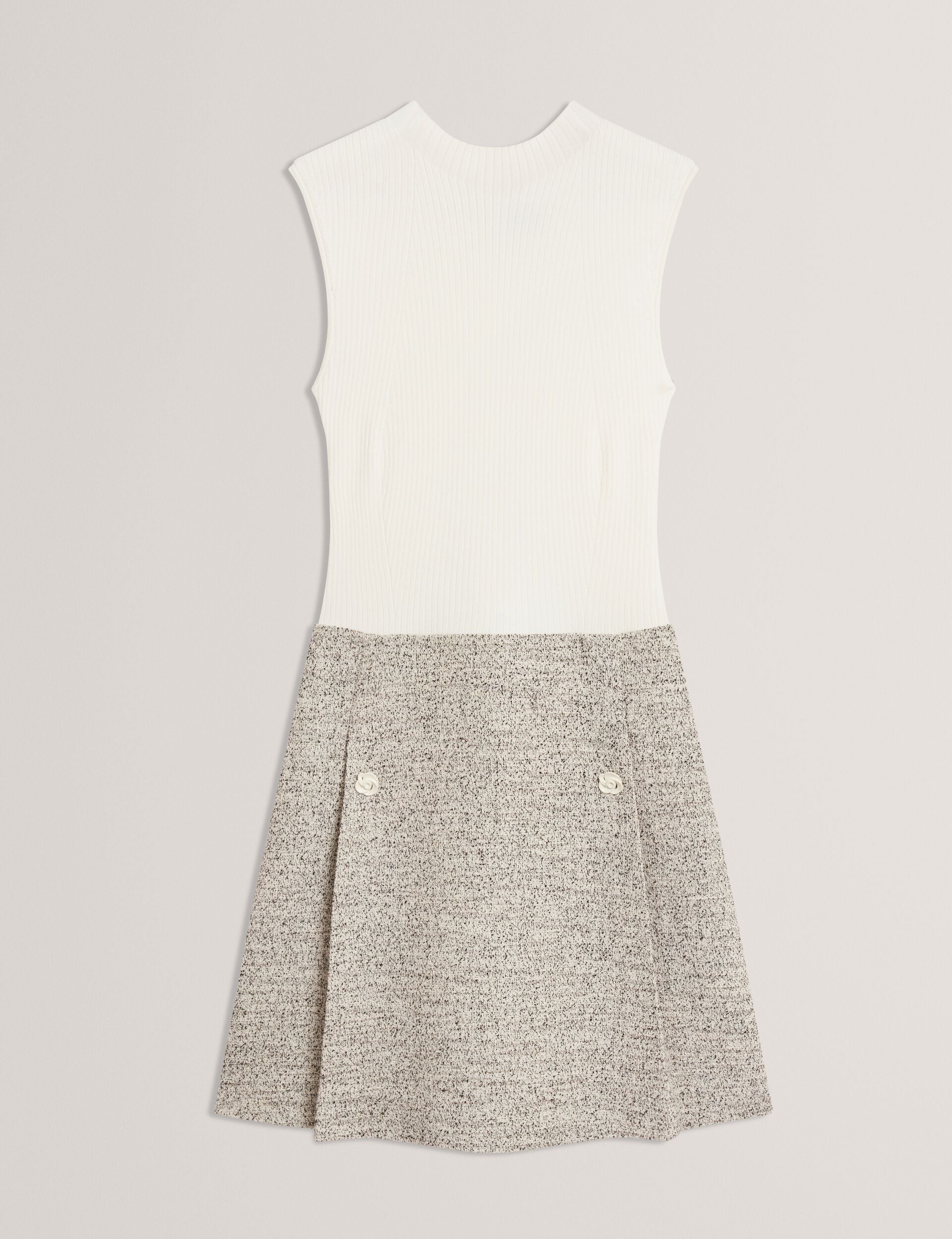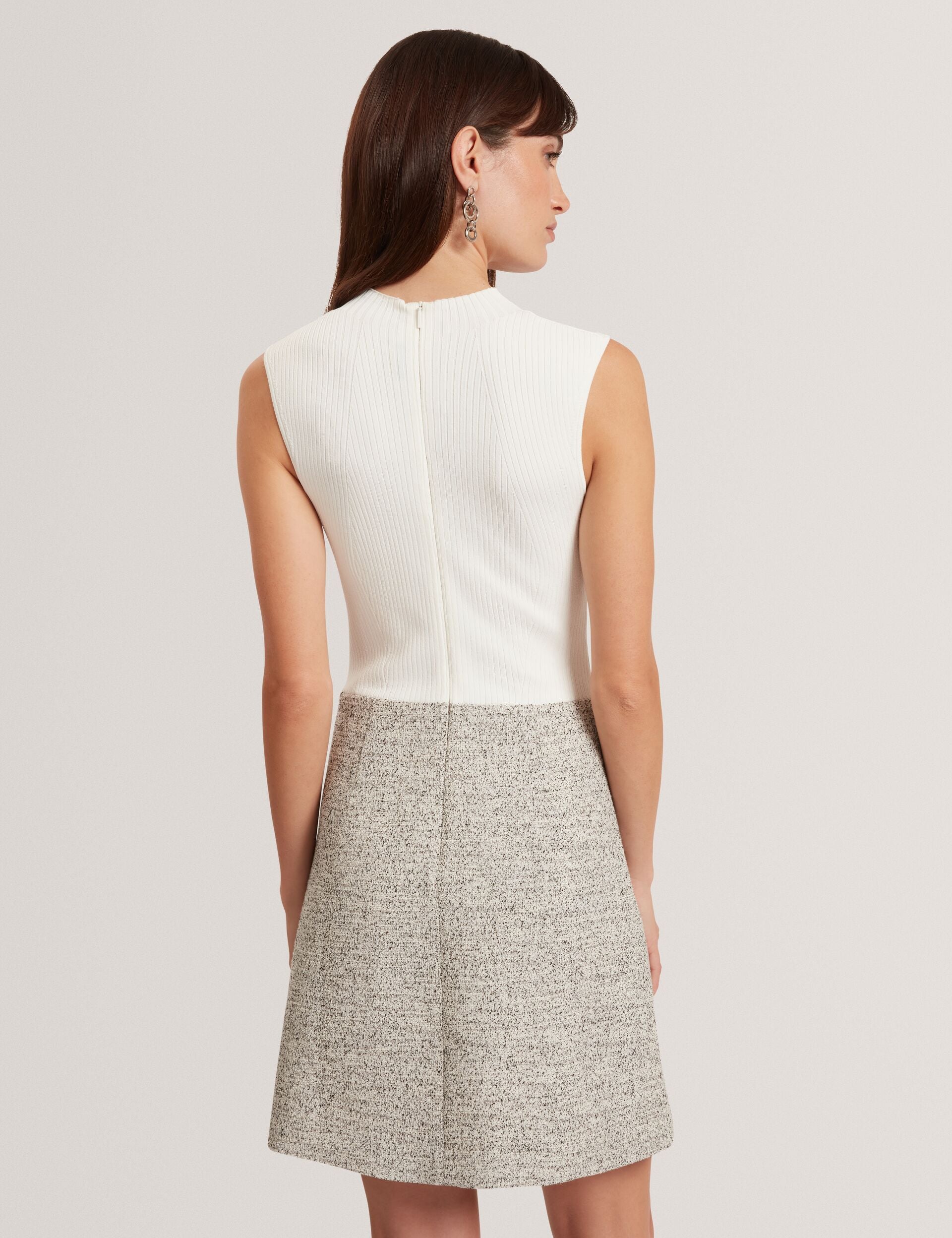 The EKAAM mini dress is the most stylish way to transition your tailored wardrobe, mixing a flattering ribbed knit bodice with a chic boucle textured skirt. Inverted pleats topped with ivory rose buttons bring the a-line shape to a feminine finish.
