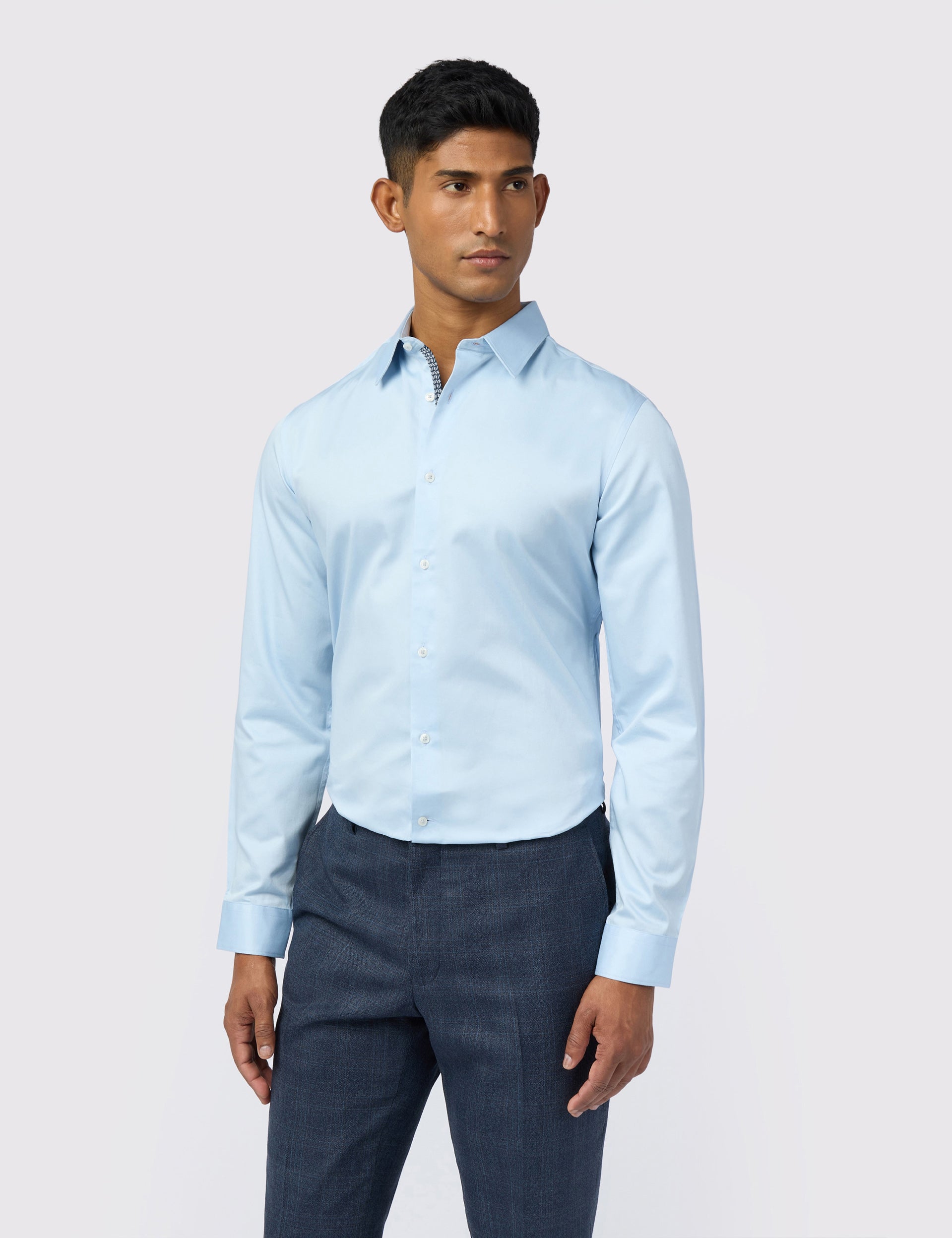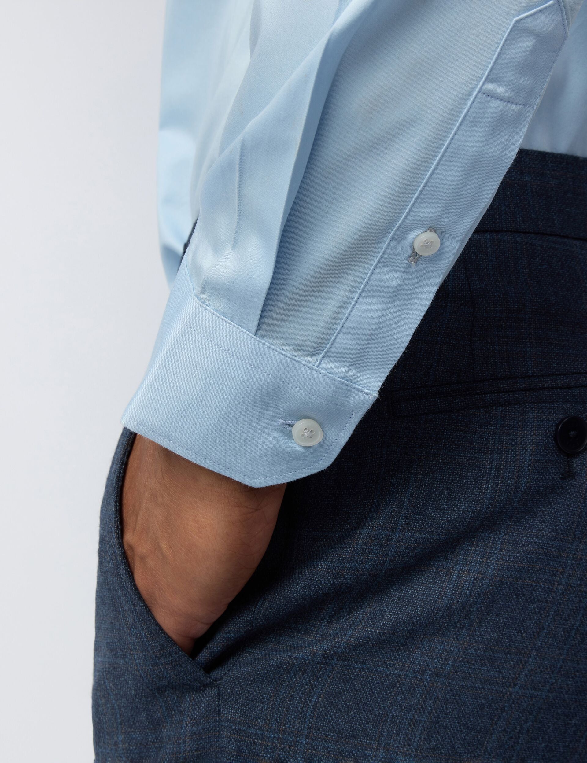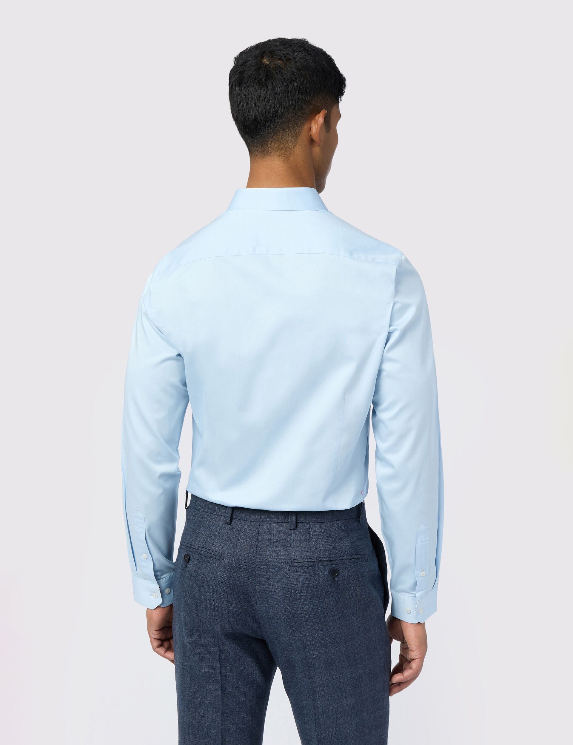Made from a soft sateen fabric in an ice blue shade, the FELIX long sleeve shirt is a modern staple for your formal wardrobe. The organic cotton blend features natural breathability and stretch, making this slim fit style ideal for wearing under suit jackets and blazers.