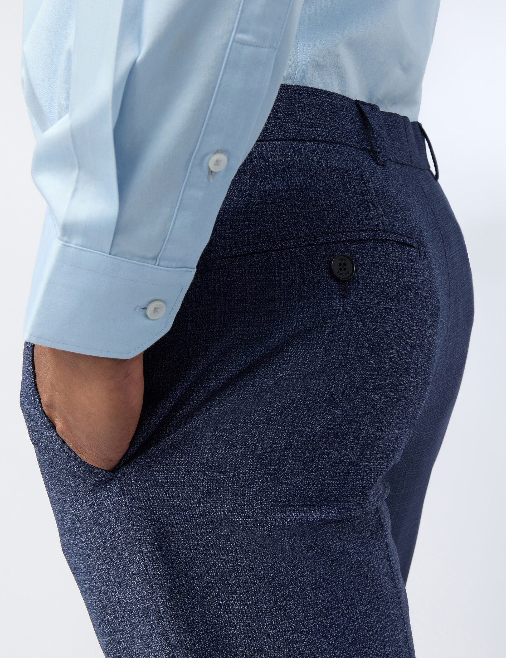 A subtle check design is added to an airforce blue base to create these sharp FOYLE suit trousers. From big business to big parties, the high-performance fabric stays crisp through it all thanks to its water and stain resistant finish. A wool-stretch blend brings endless comfortable to its contemporary slim fit.