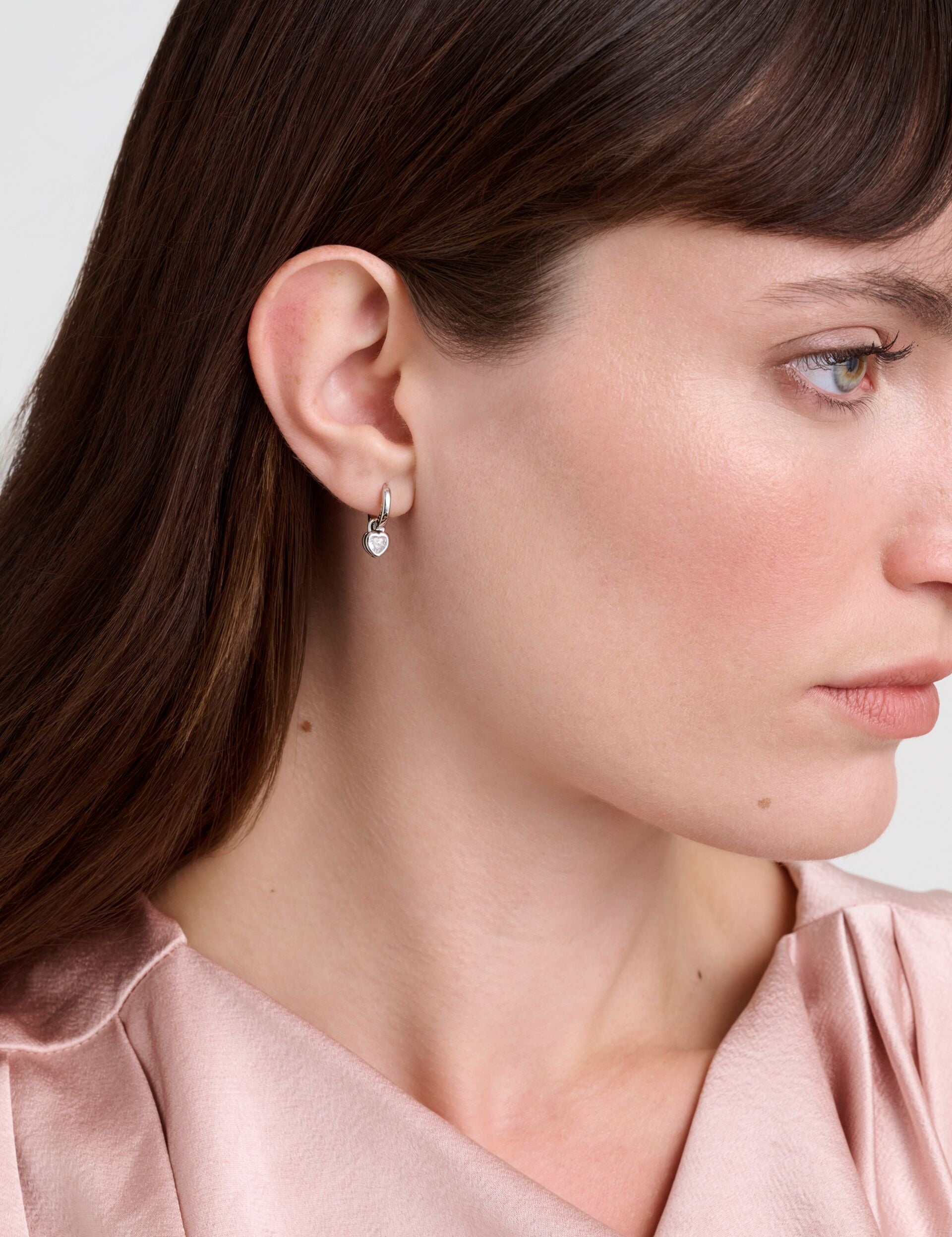 The HARPERS huggie earrings bring subtle sparkle and movement, featuring a mini crystal heart pendant hanging from a shiny silver-tone hoop. They add a sweet touch that works for everyday looks as well as dressier moments.