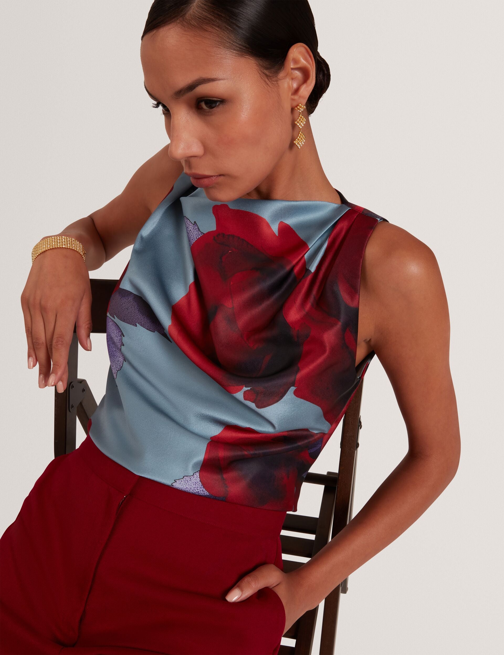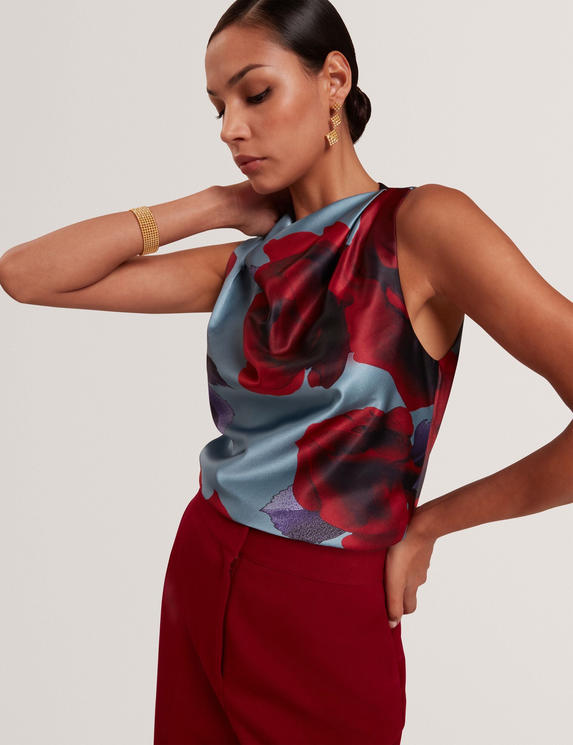 Deep red roses bloom against the soft blue satin of this HARPLYN sleeveless top. Add in the graceful draping at the neckline, and you've got the most sophisticated statement for your dressier moments.