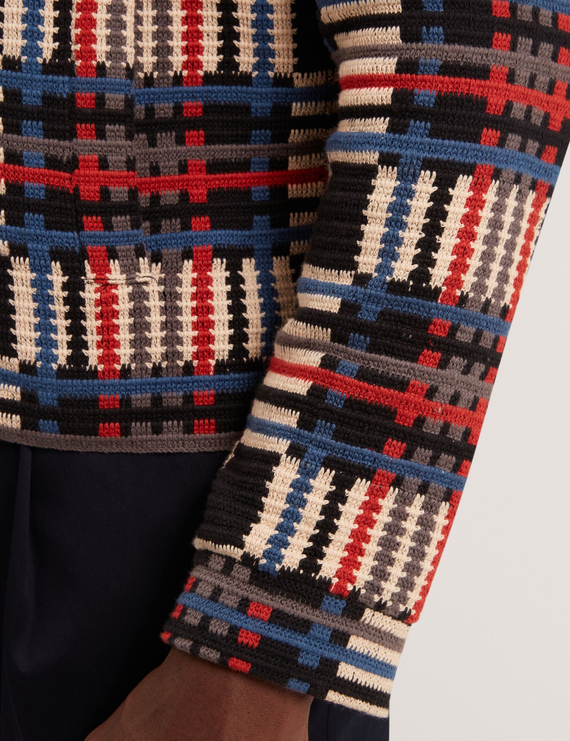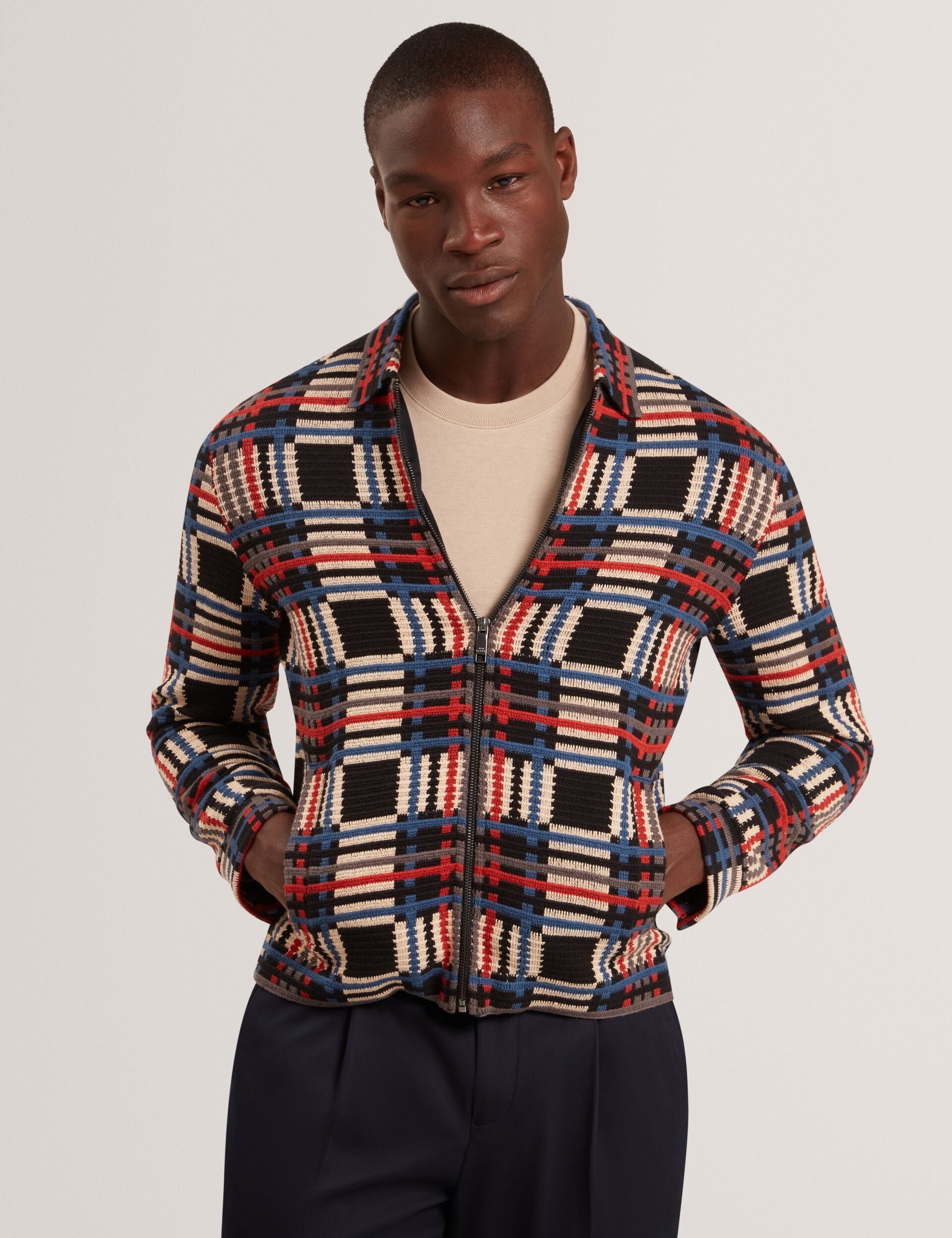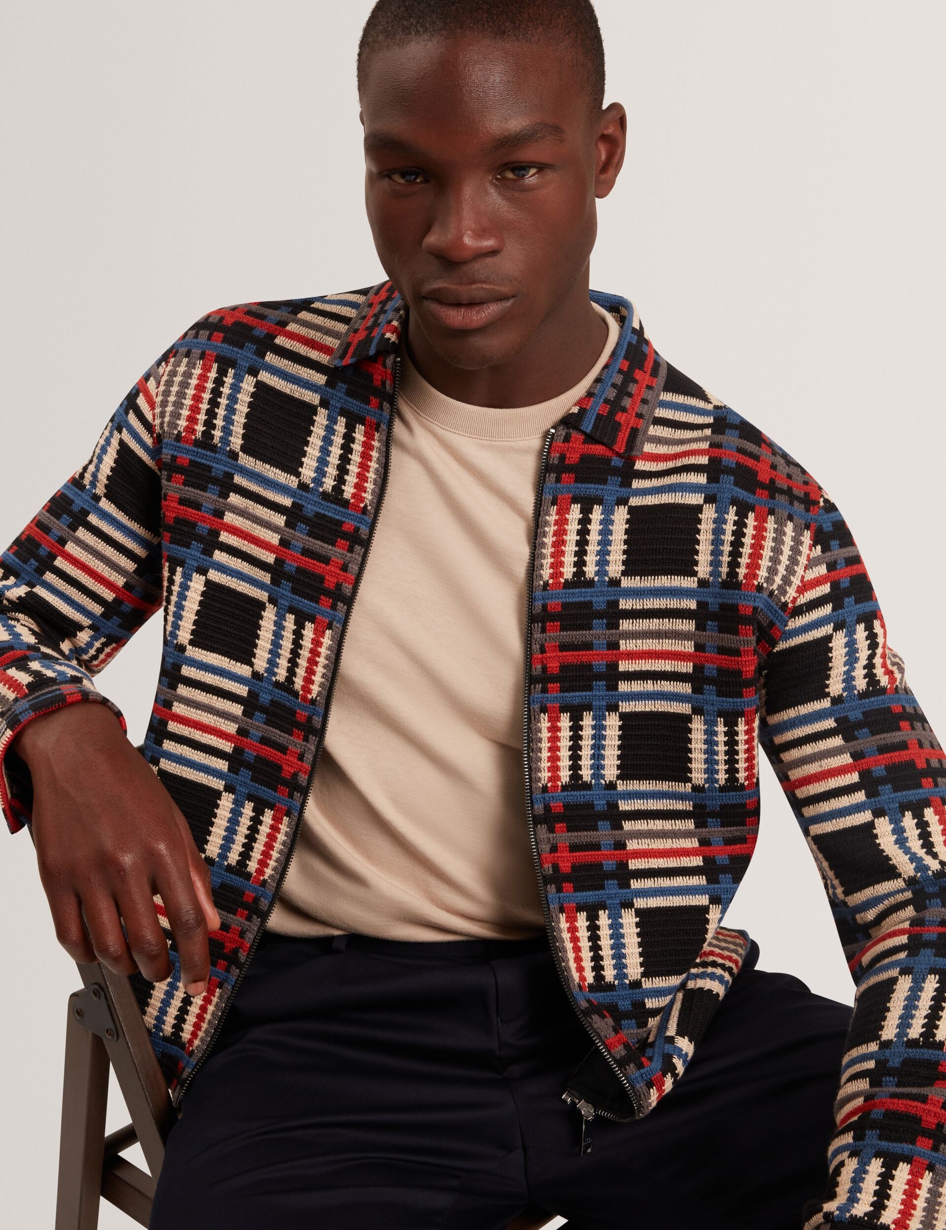 Boldy layer with the HENREIN knit jacket. Crocheted with a bold patchwork check design that feels suitably retro, we've added a classic collar and zip-through fastening to keep things smart and easy to style. Add it to a plain tee and classic jeans, and you've got an everyday statement.