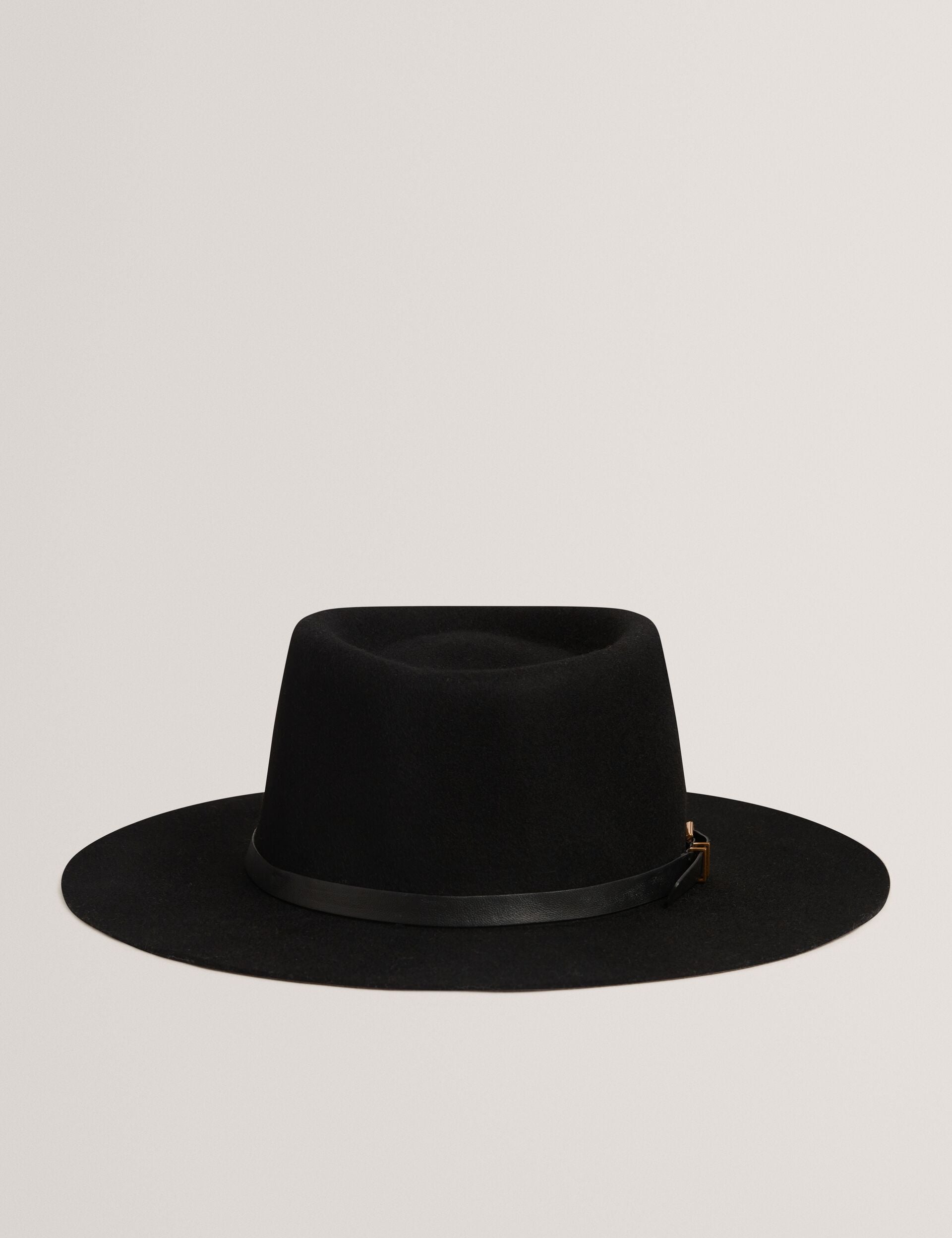 Shell: 100% Wool; Sweatband: 100% Polyester; Trim: 100% Bovine leather