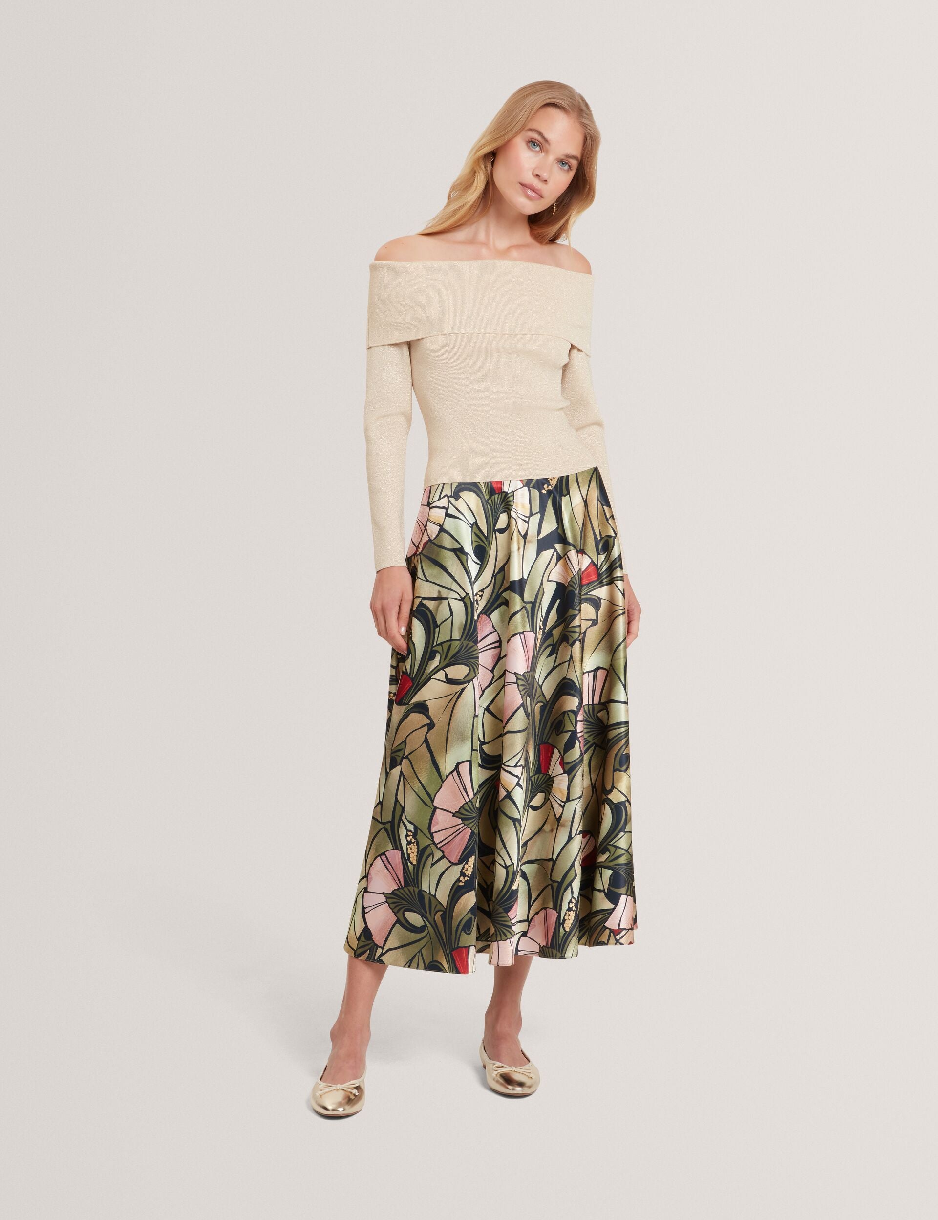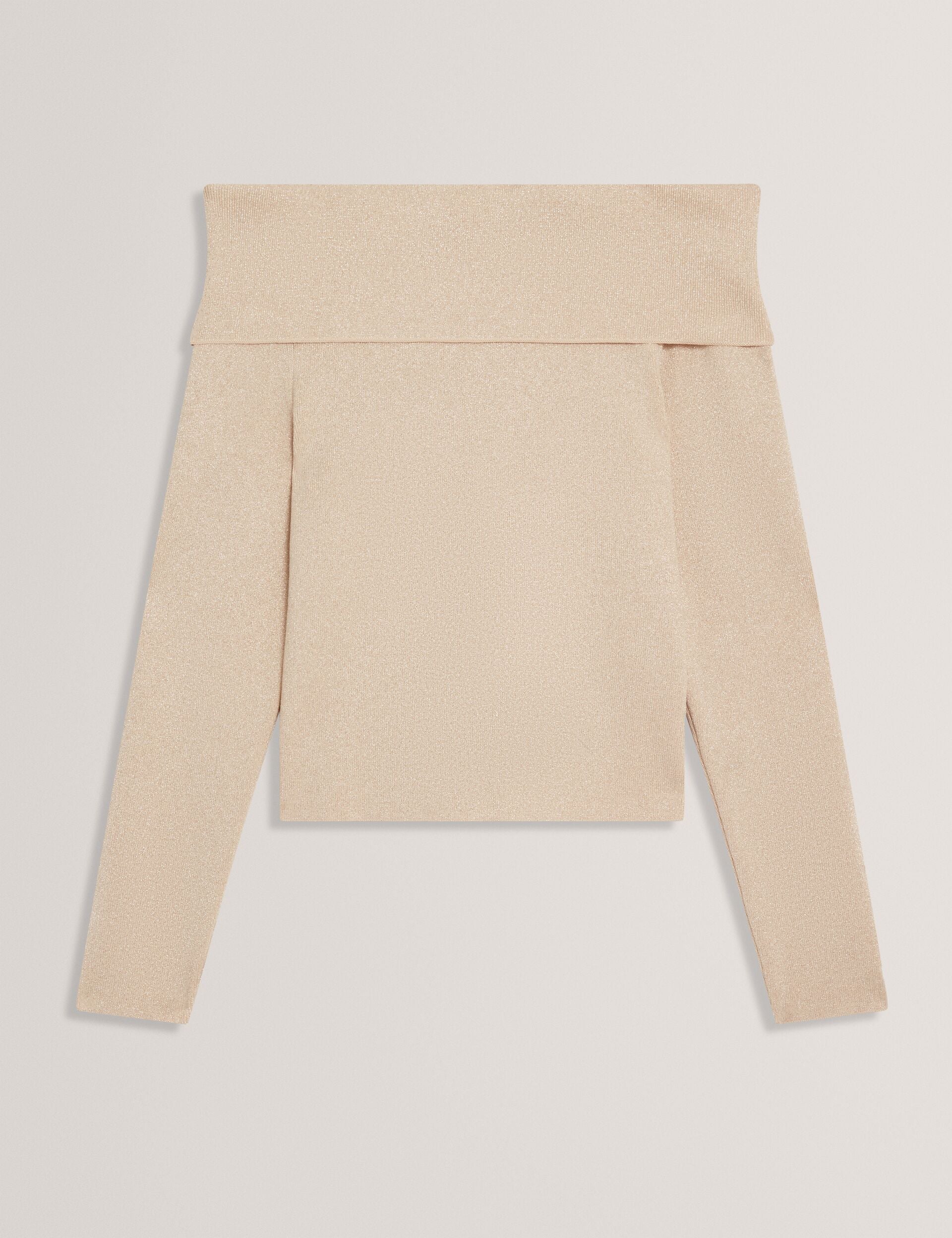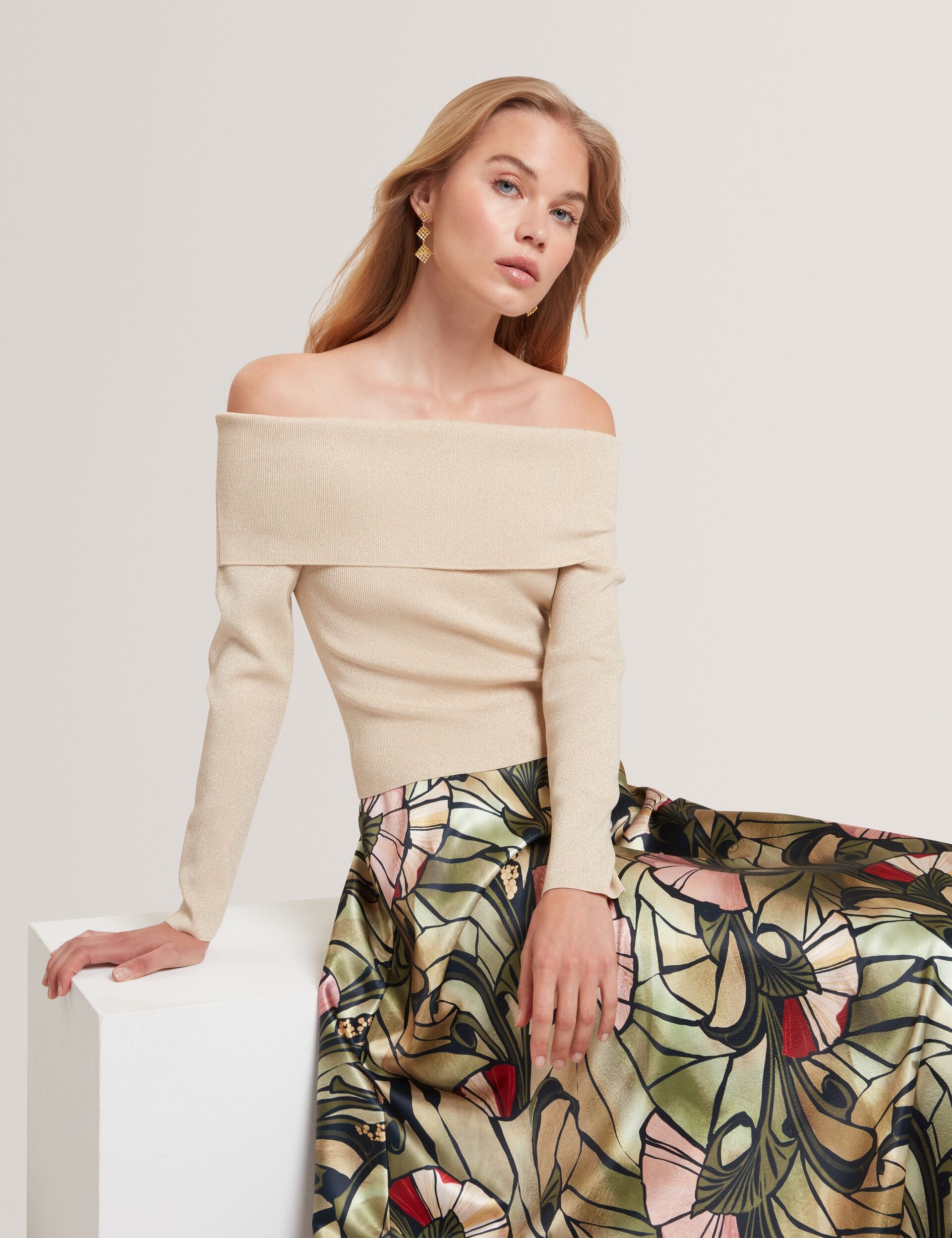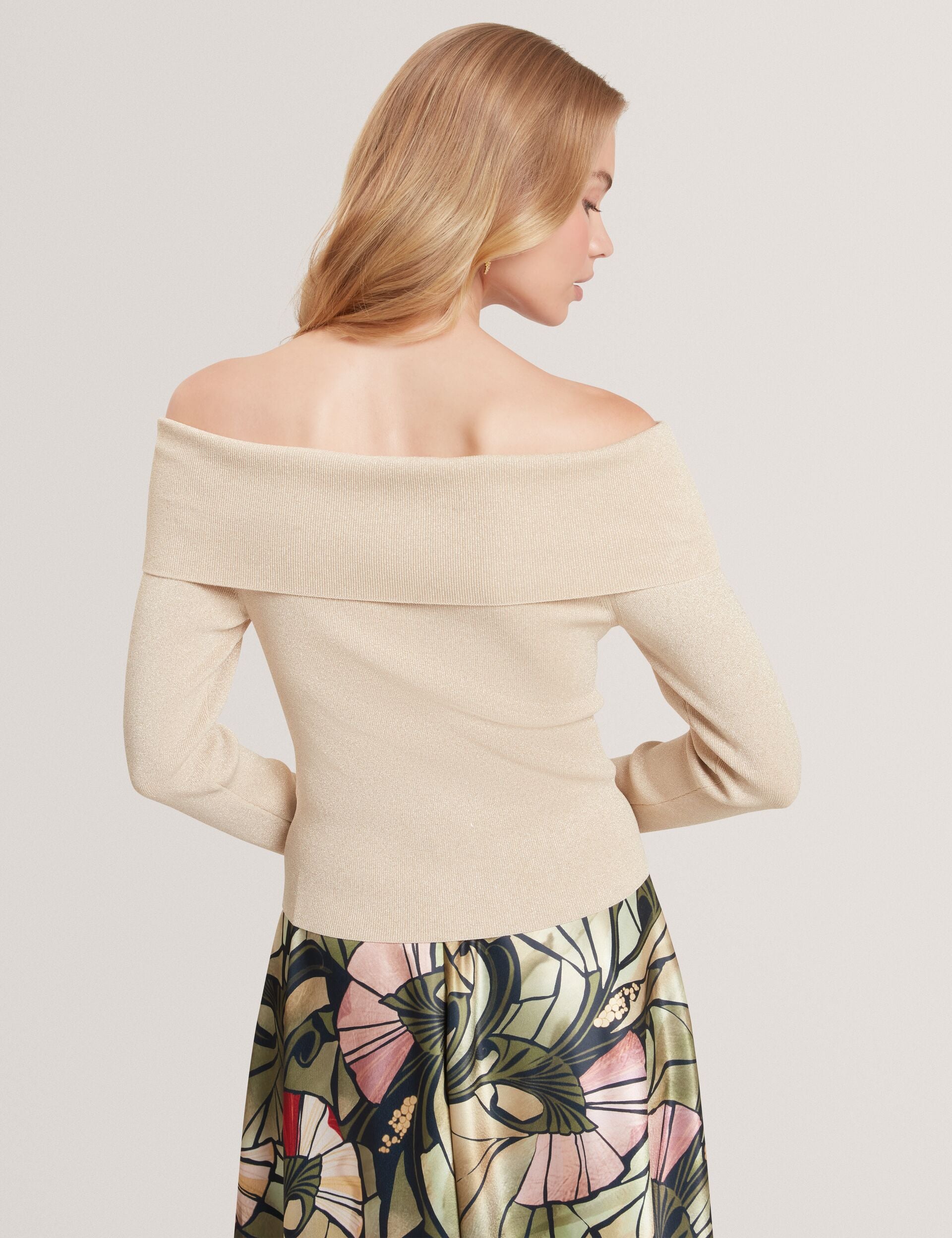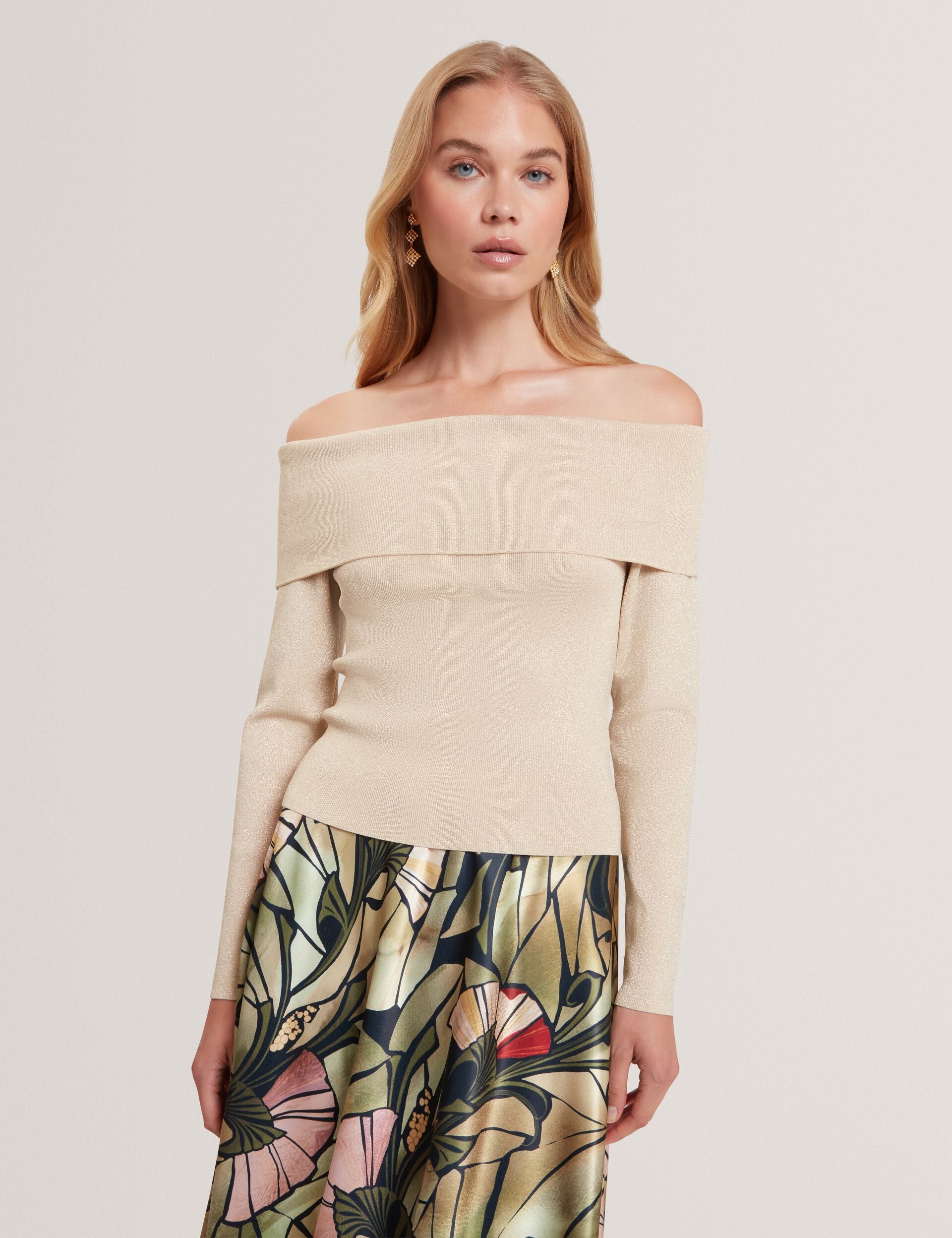Be the "it" girl this party season in the LAYCII fitted knit top. Metallic yarn weaves elegant shimmer into the champagne coloured knit, and the foldover bardot neckline gives it that 90's style twist. Classic jeans, printed skirts, tailored trousers - it all works with this dressy staple.