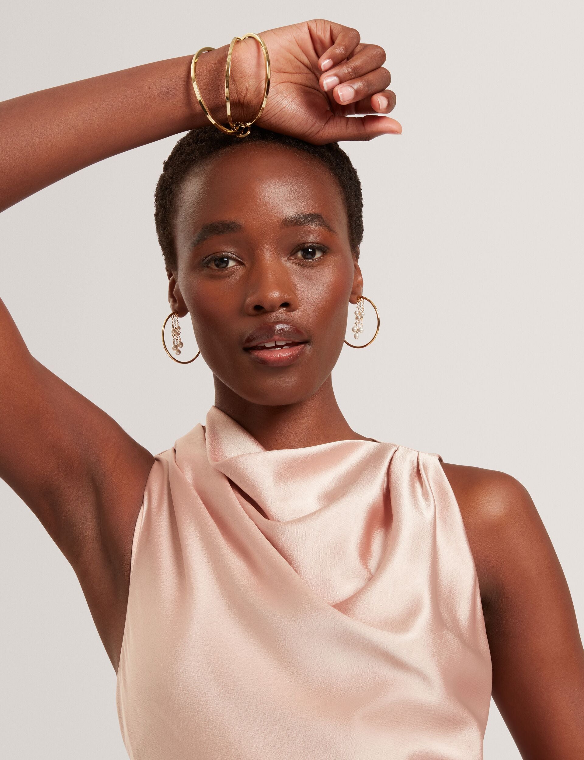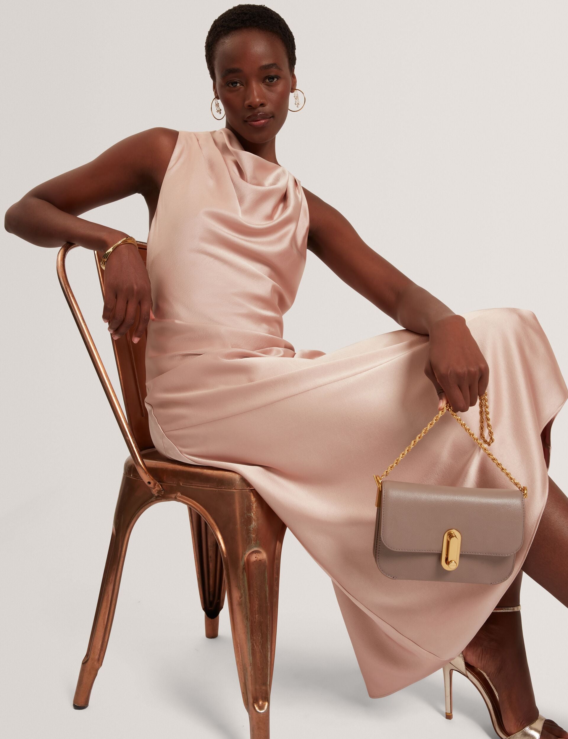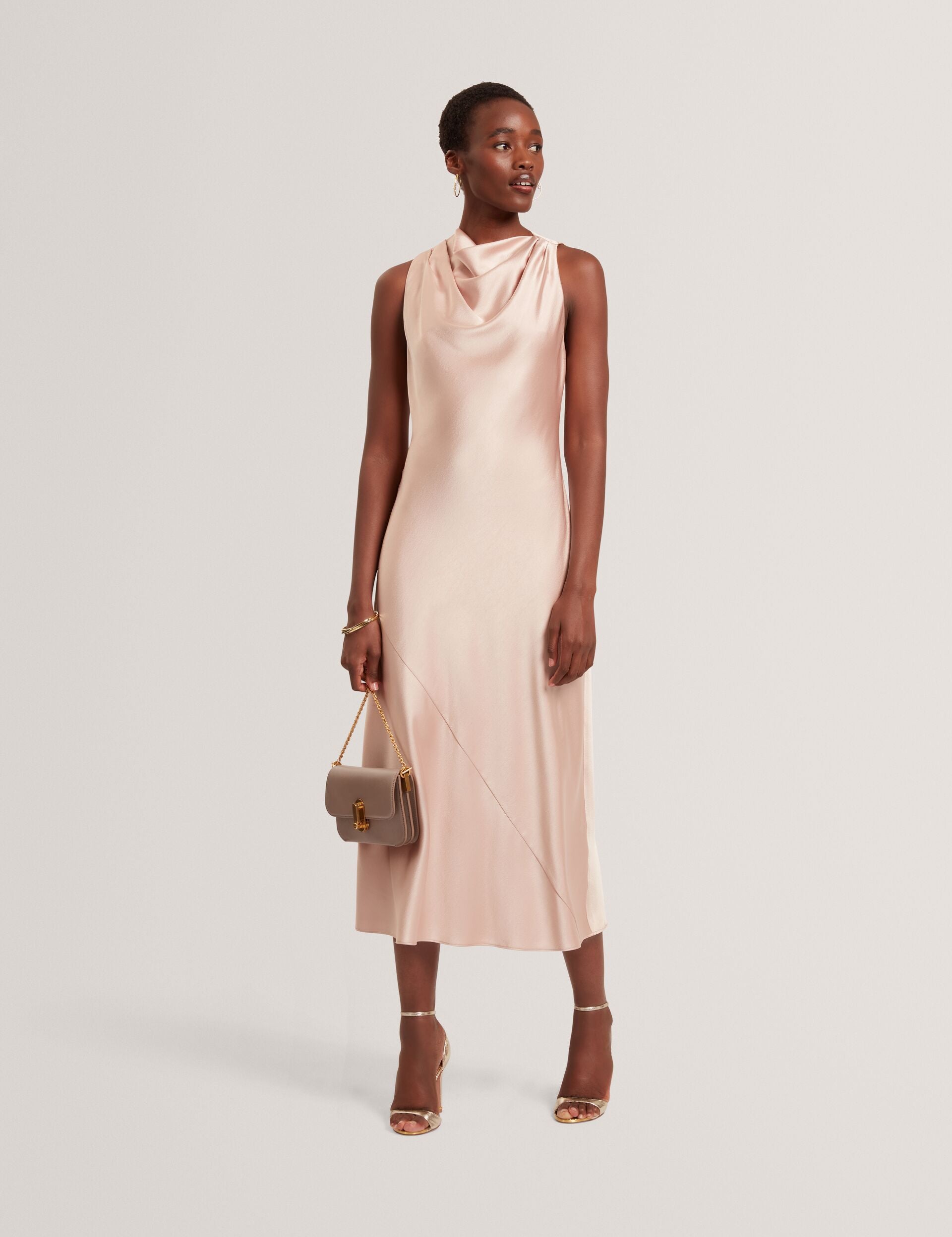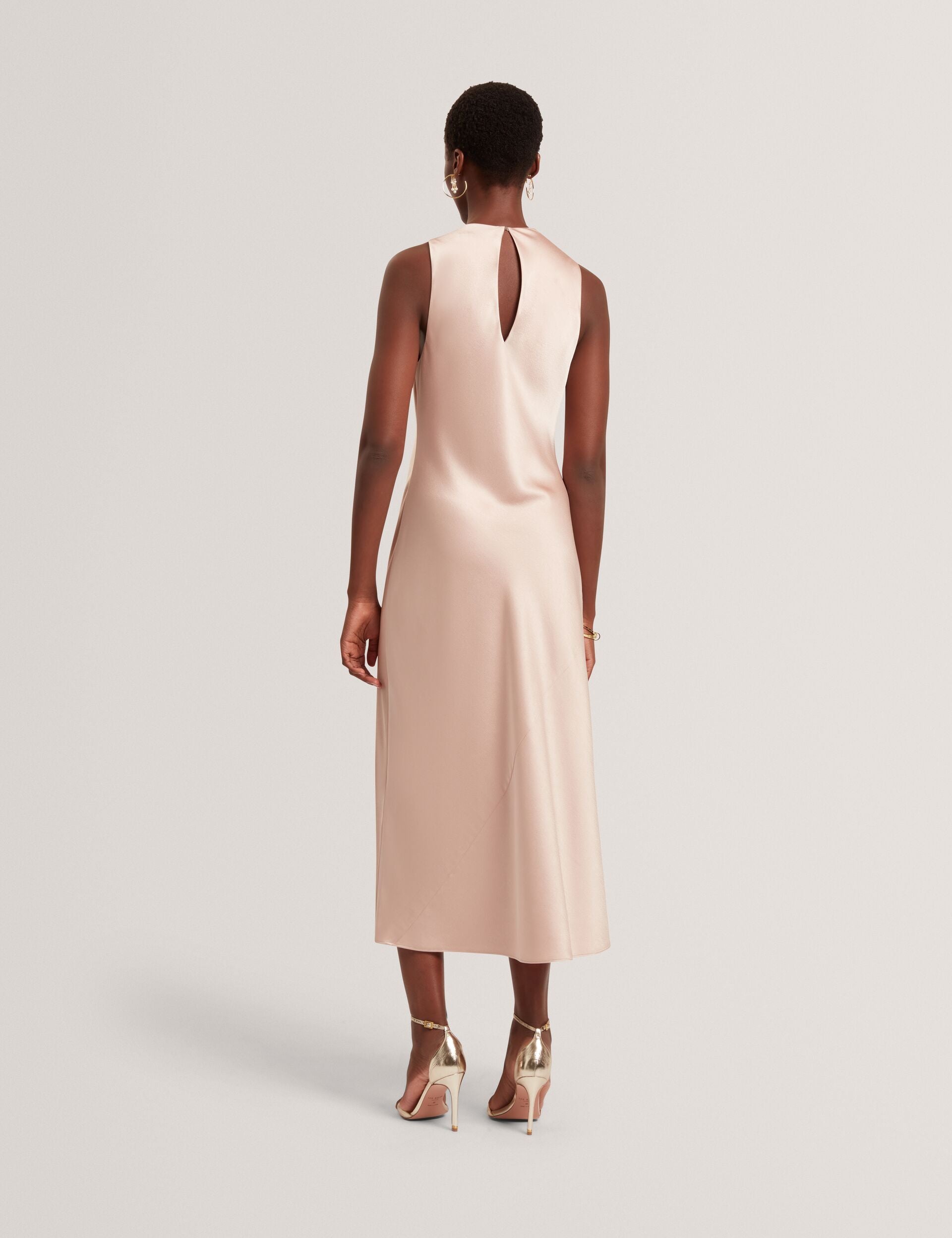 Turn heads, but do it elegantly in the LIIMAA sleeveless midi dress. Crafted from a dusky pink satin fabric, its flowy bias cut is complemented by delicate draping at the neckline, creating a piece that oozes femininity.