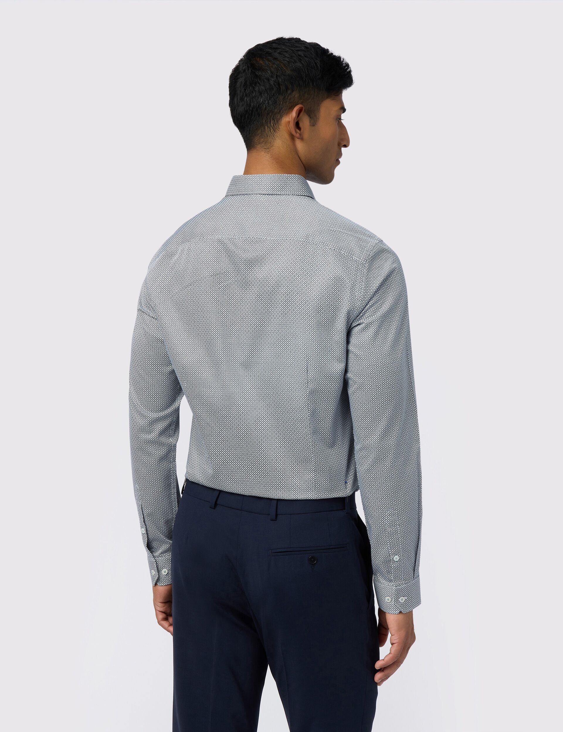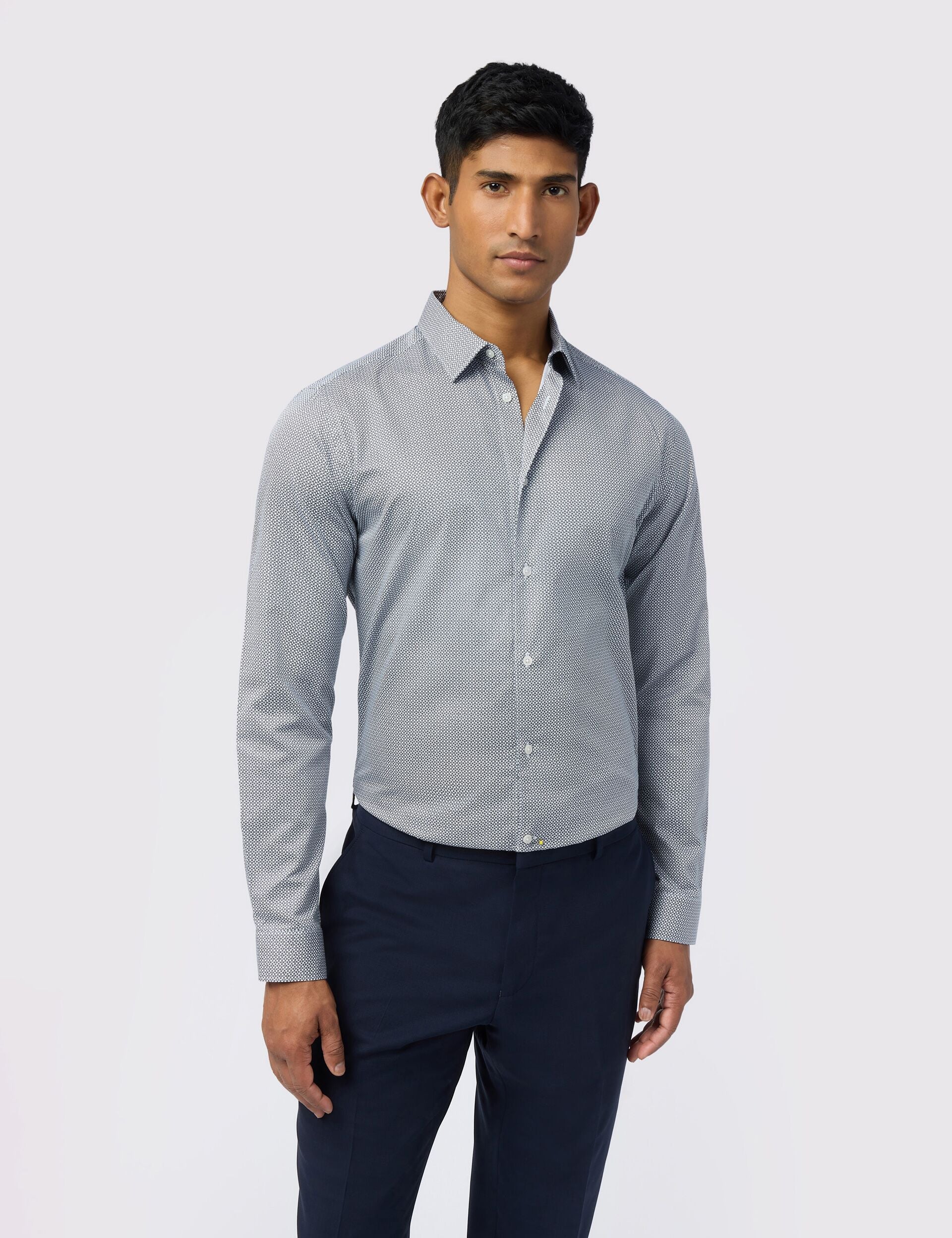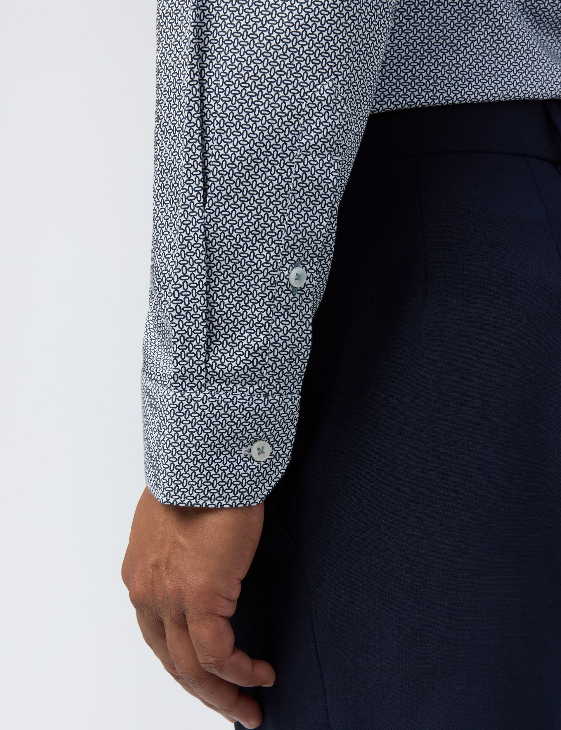 Give your suiting a printed twist with the LIN slim fit shirt, featuring a geometric dash pattern on a crisp sateen fabric. A hint of stretch is added to the breathable organic cotton blend to provide all-day comfort, complete with adjustable button cuffs.