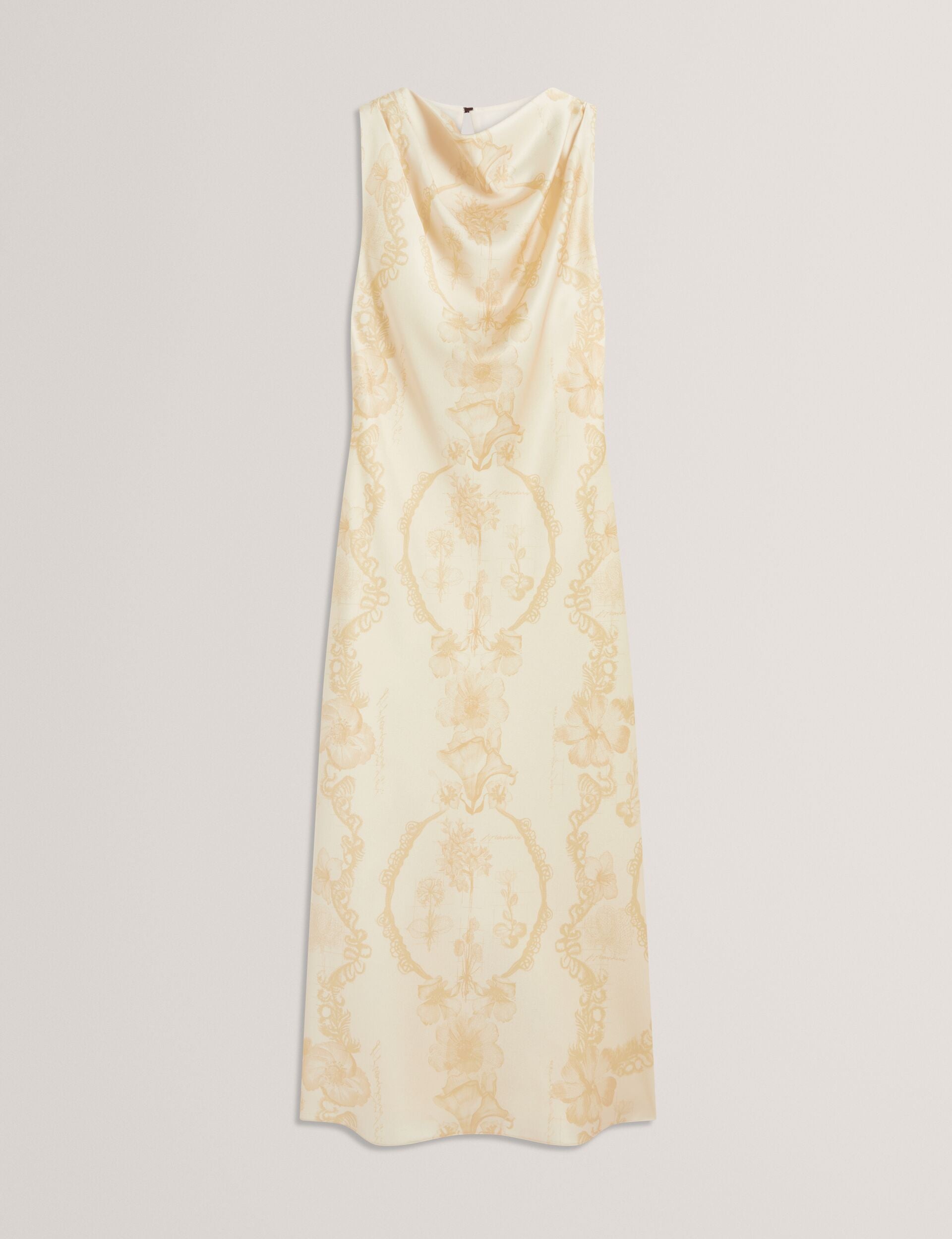 Lace Print Cowl Neck Satin Midi Dress