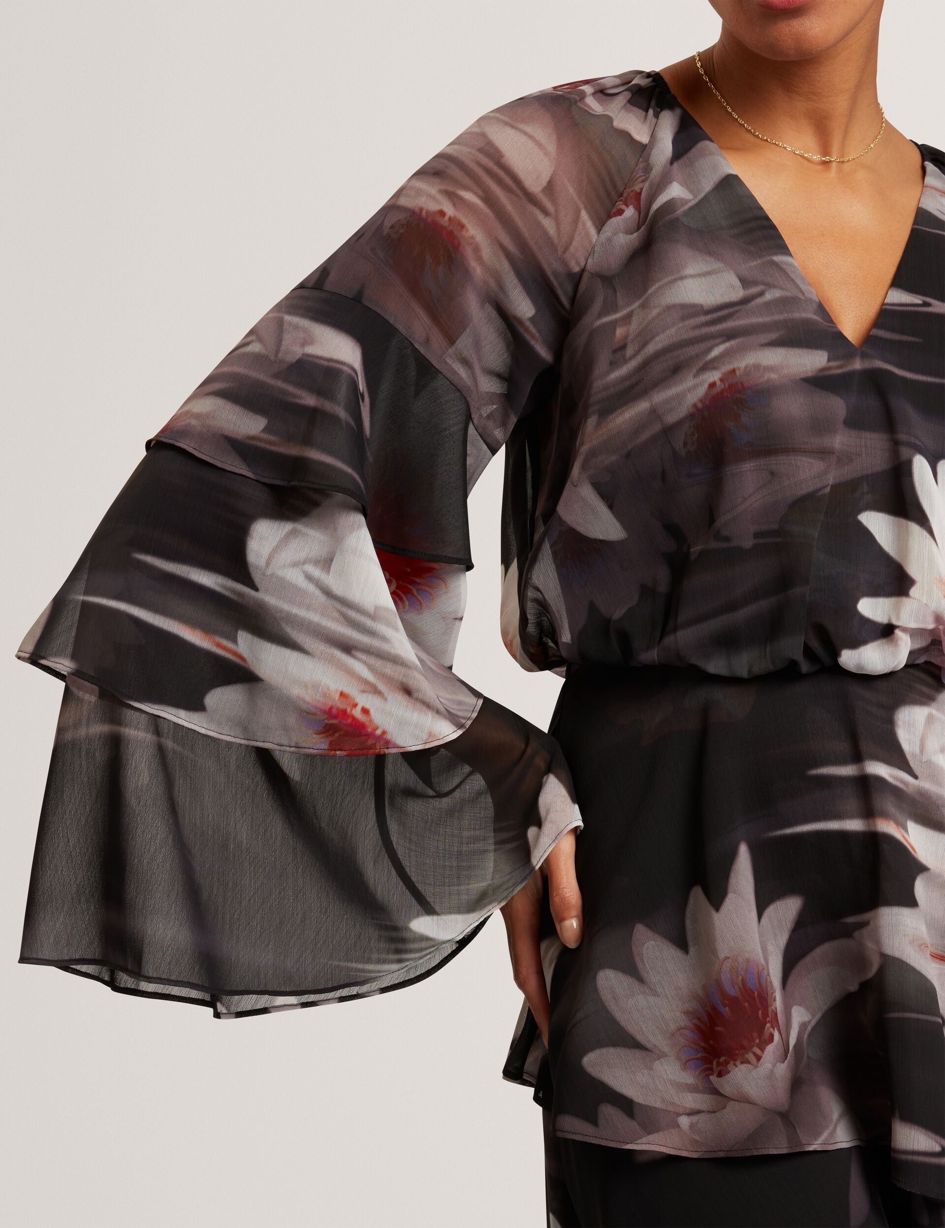 - Tiered frills on sleeves & skirt