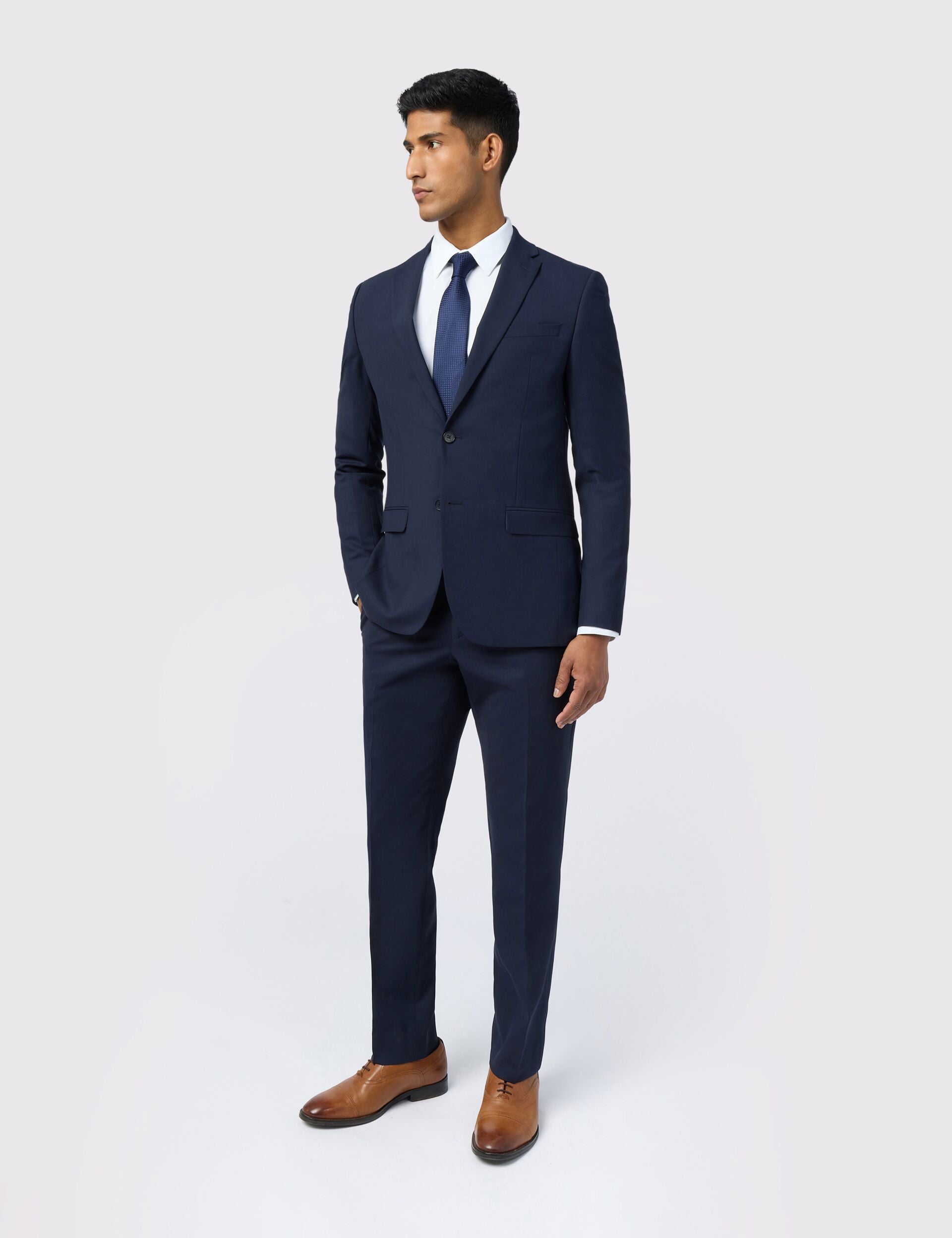 Timeless tailoring that's designed to last - it's the PINDAR navy suit jacket. Cut to a classic slim fit, it's crafted from a high-performance wool blend with a comfortable stretch finish, as well as being water and stain resistant. For the fancier occasions, pull the signature jacquard lining out of the chest pocket for an instant pocket square.