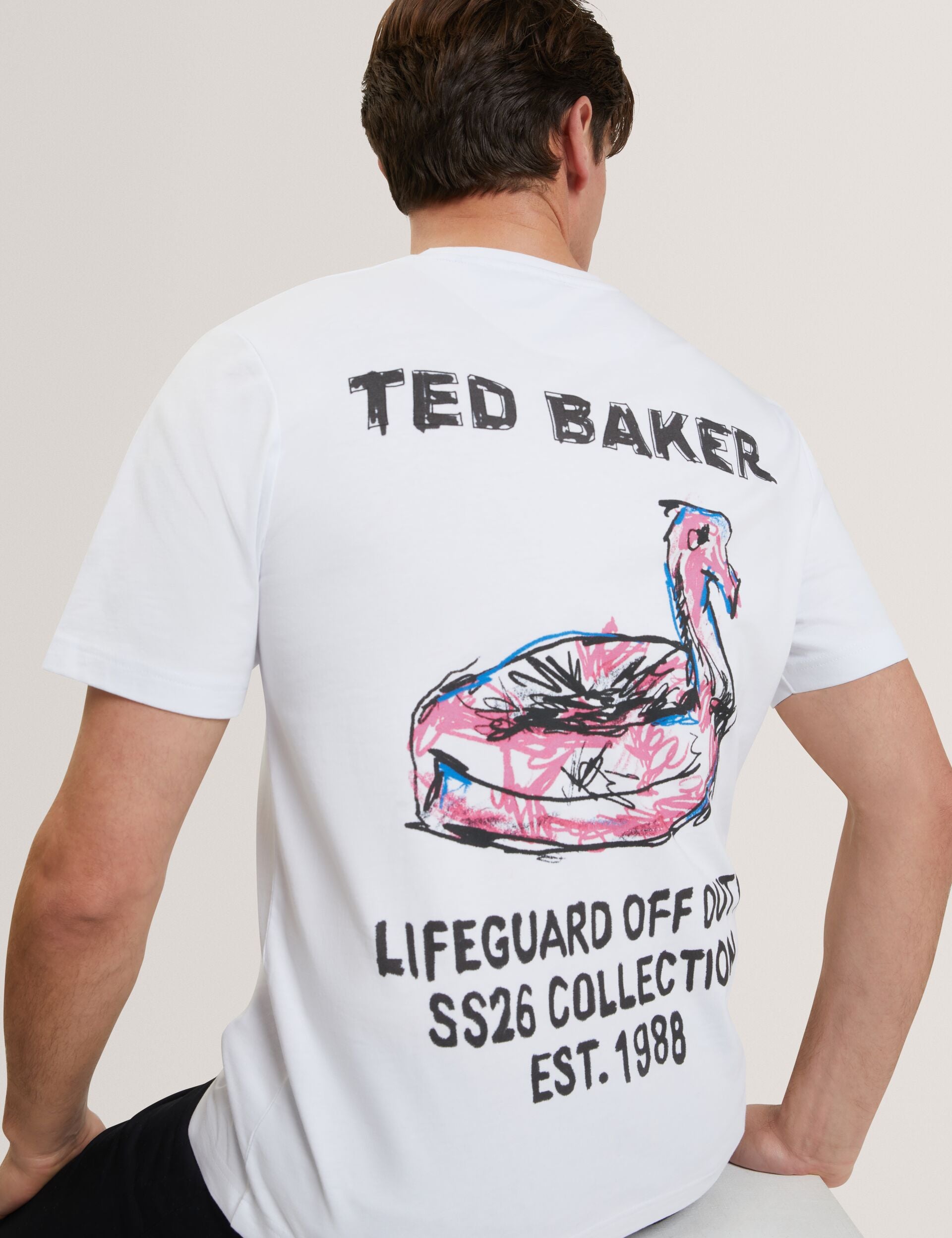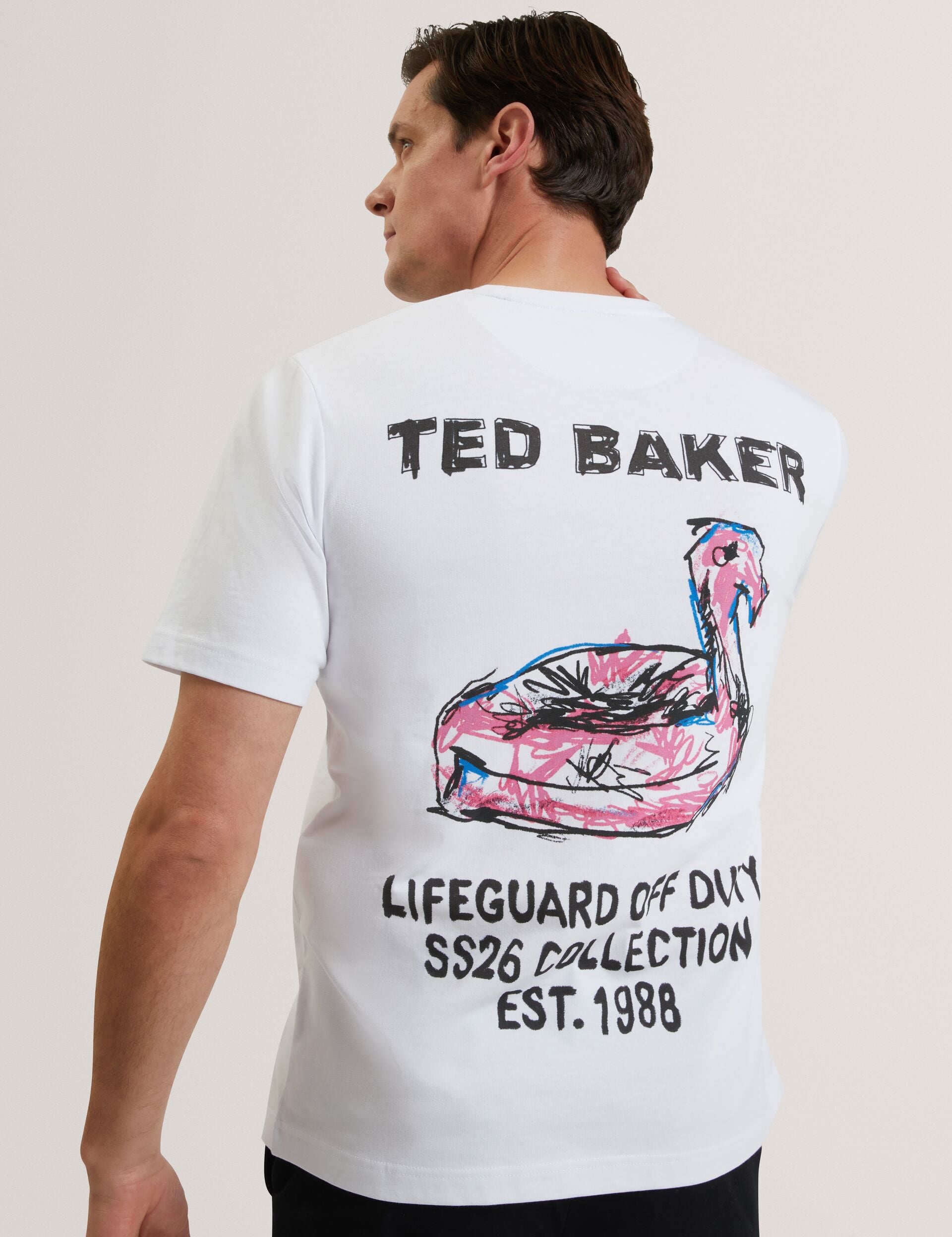 Subtle logo detail on the front, bold graphic design on the back. The RAMOSS crew neck t-shirt features a flamingo pool ring back graphic sketched in vibrant colour, ready to bring statement flair to your casual outfits.