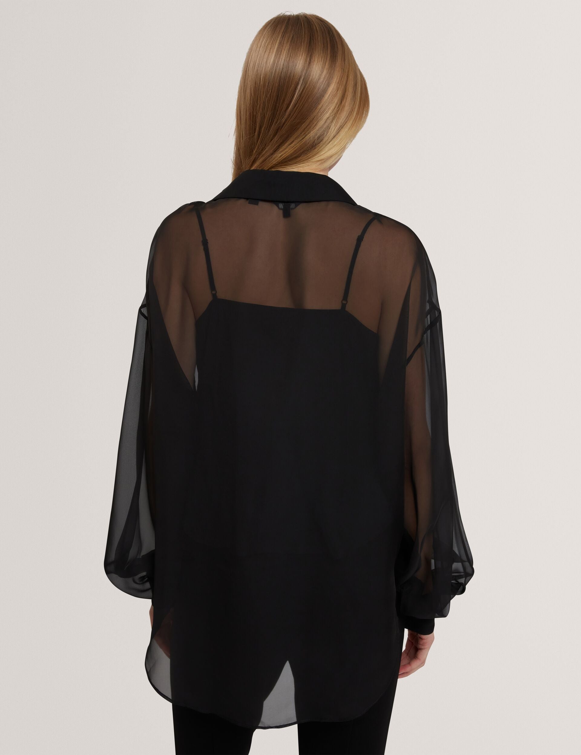 The RASIIA longline shirt is your day-to-night hero with its sheer black fabric and flowing relaxed shape, complete with a textured bib detail that adds subtle interest. Wear with leggings or slim leg jeans to let its silhouette shine.