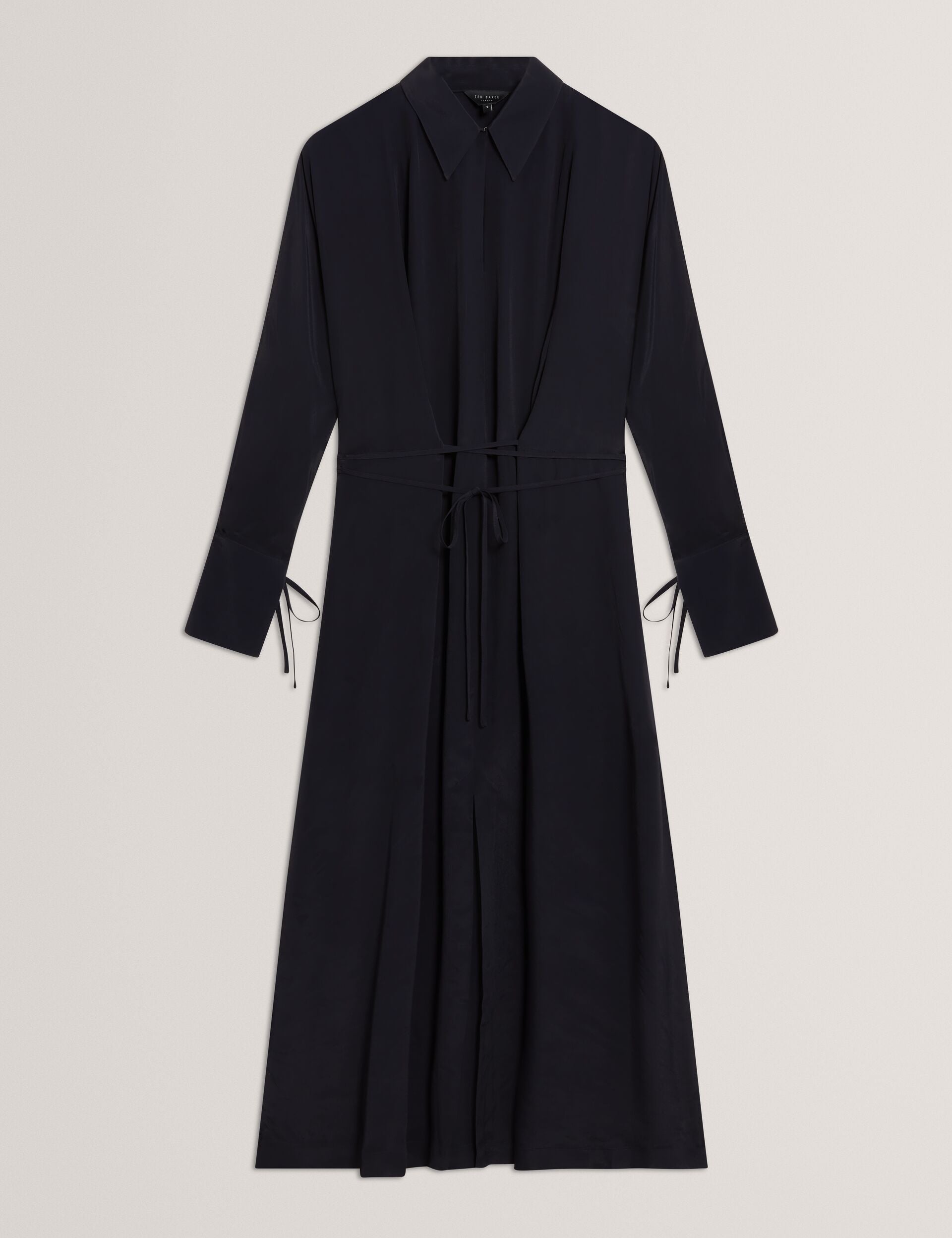 A sophisticated staple you'll reach for all year long: meet RHAEAA. This midi shirt dress is crafted from a light crepe fabric with the perfect drape, and features delicate tie details at the waist and sleeves that can be worn how you like it. The collared neckline is fitted with a keyhole opening that can be left open for a more relaxed V-neck look.
