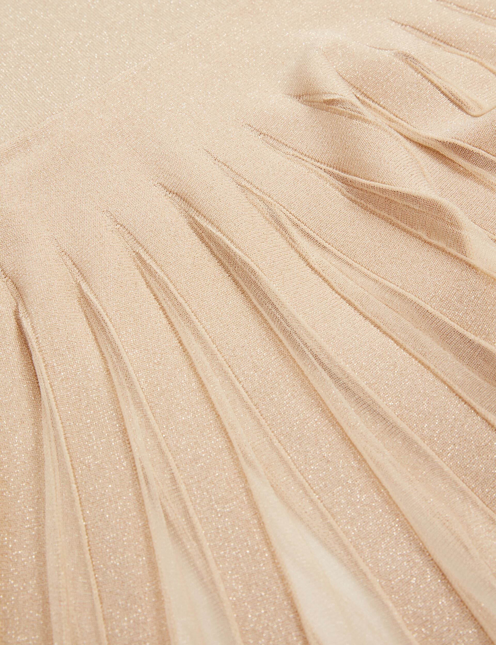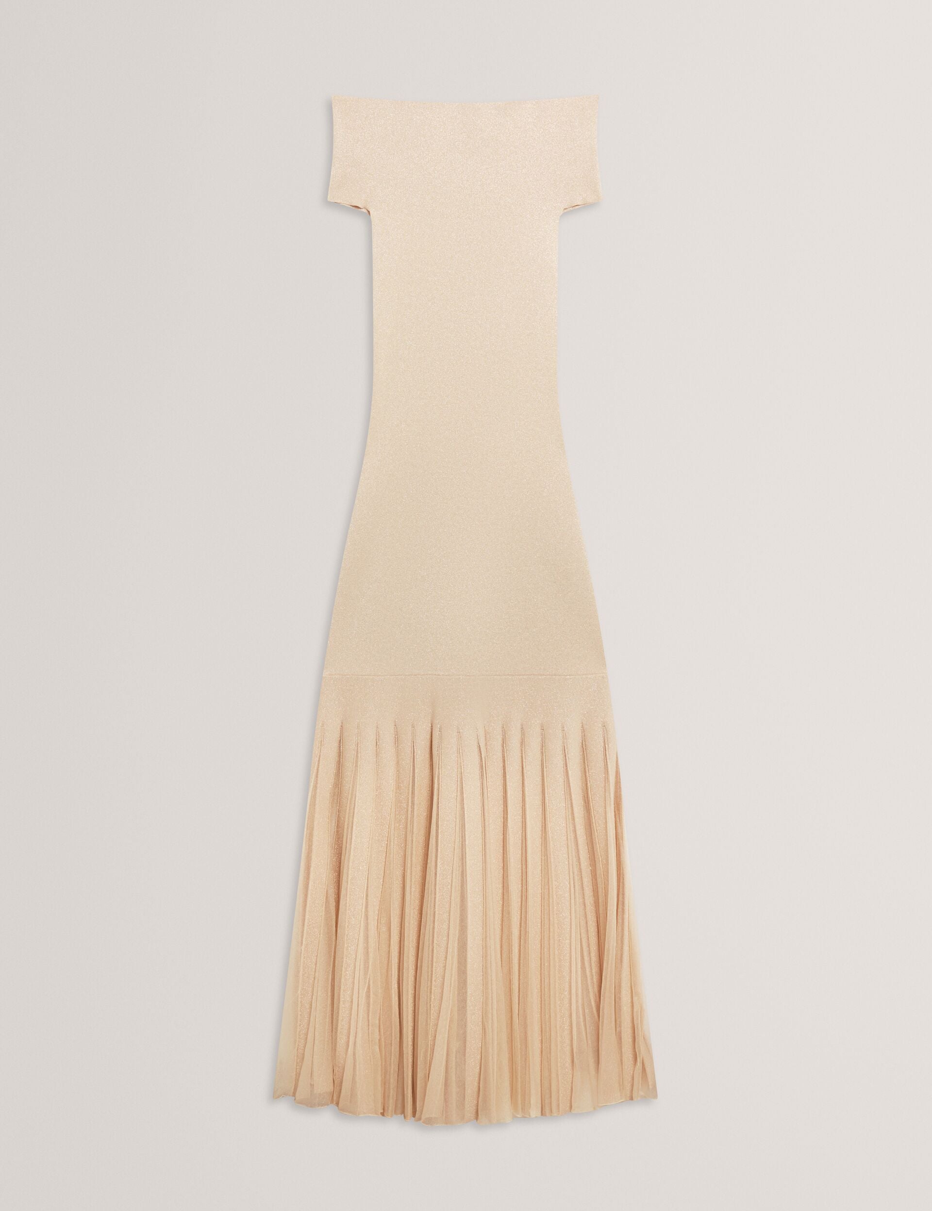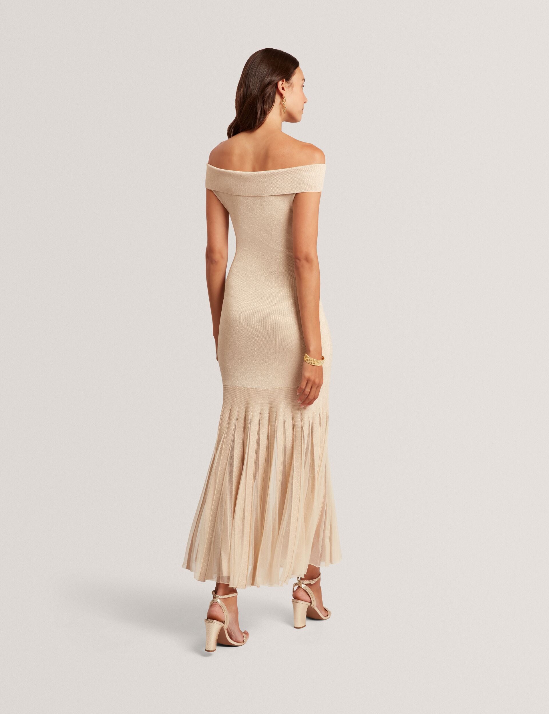 Make an entrance this festive season in the RYLLA knit maxi dress. Bringing party-worthy shimmer with its metallic yarn knit, this flattering bodycon silhouette starts with a sophisticated bardot neckline and flows down to a flippy sheer detail hem for a feminine swish.