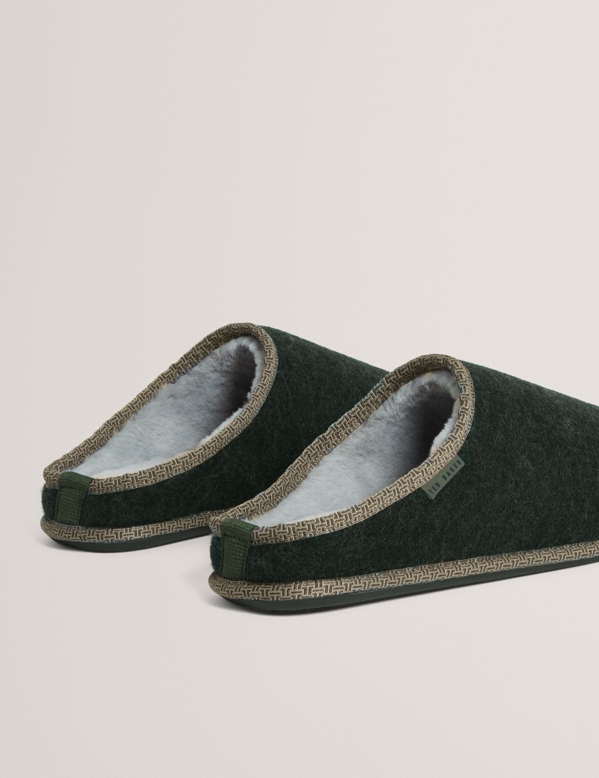 Classic mule slippers with that signature Ted detail. SIMMONN are all-out cosy with a felt wool fabric and plush faux fur lining, complete with a comfortable cushioned footbed. Contrast colour details and T-texture trims keep you stylish in your down time.